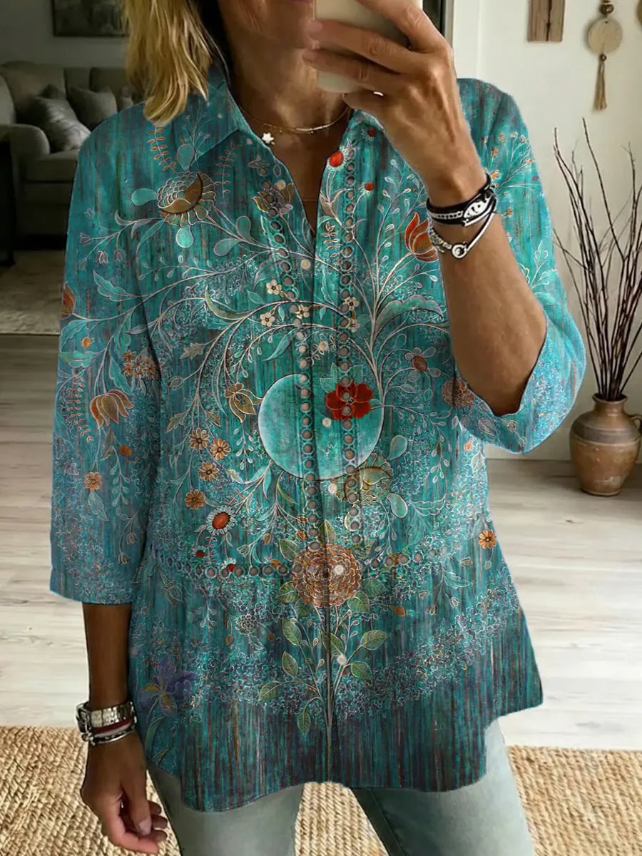 Women's Retro Floral Art Print Casual Lapel Cotton Shirt