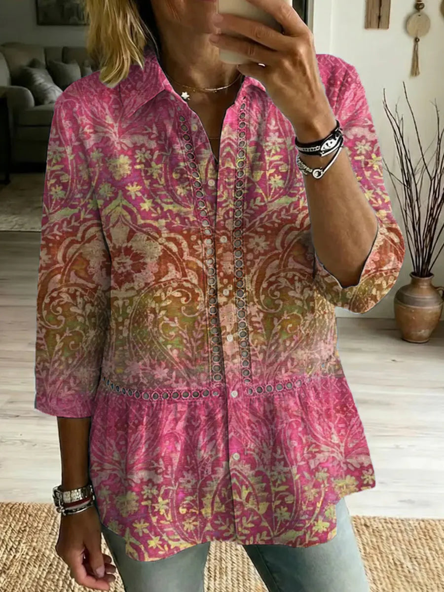 Women's Retro Floral Art Print Casual Lapel Cotton Shirt