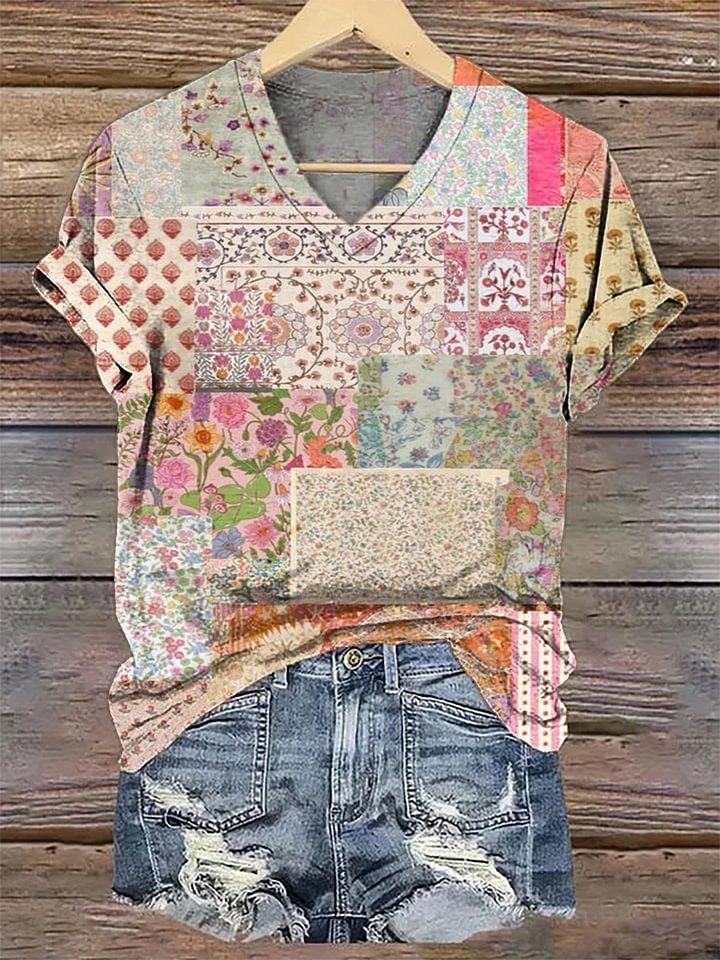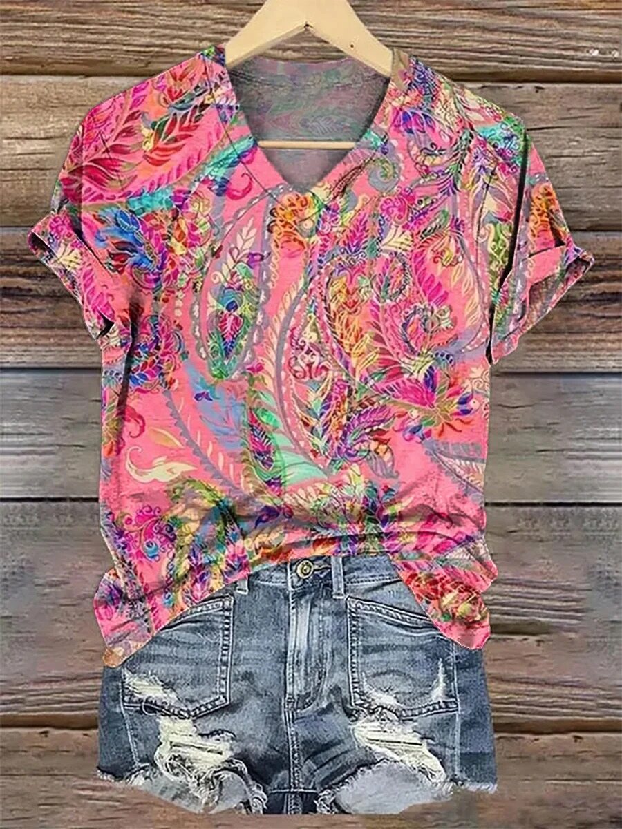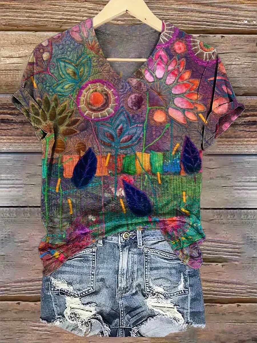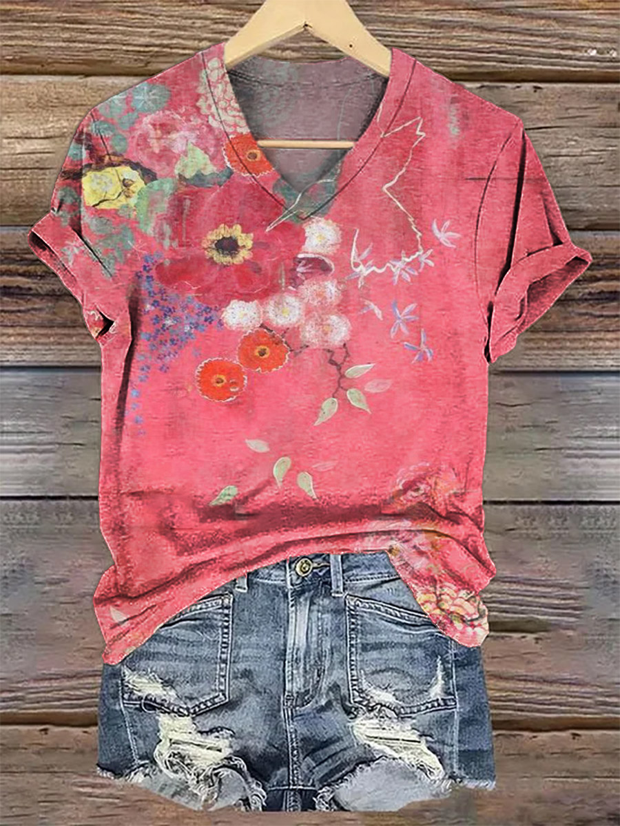 Women's Retro Flower Print V-neck Casual T-Shirt