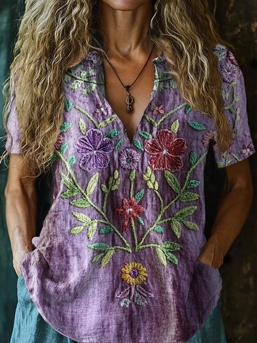 Women's Vintage Ethnic Floral Art Print Casual Cotton Linen Shirt
