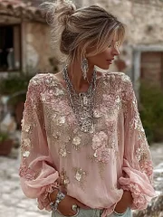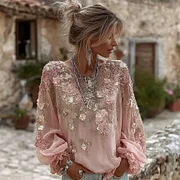 Women's Floral Embroidered Art Round Neck Blouse