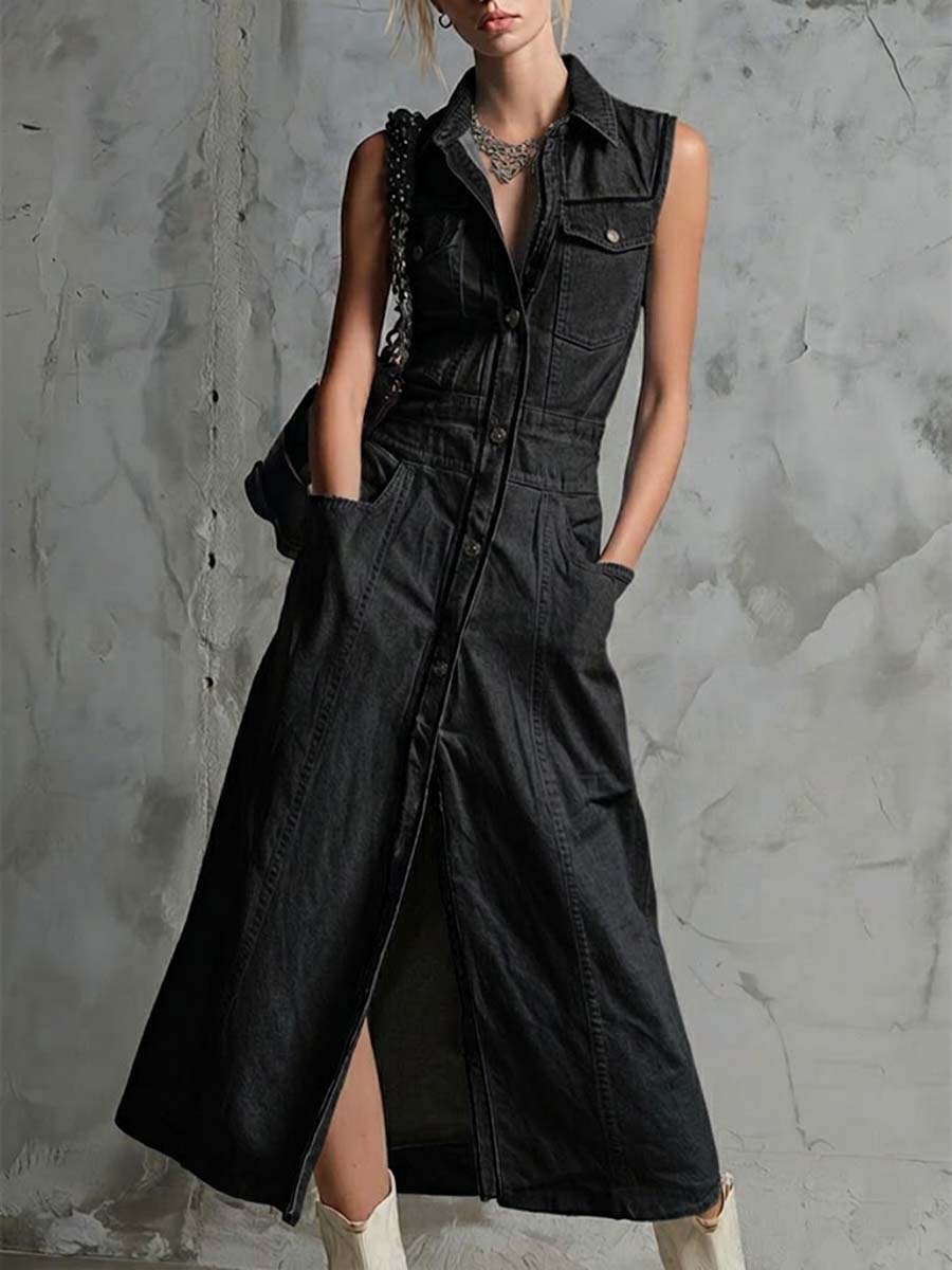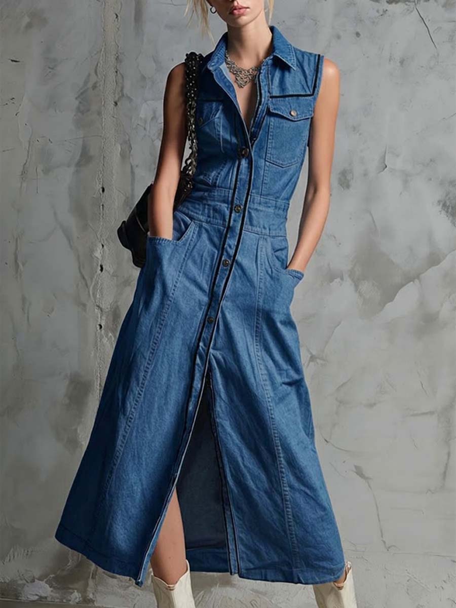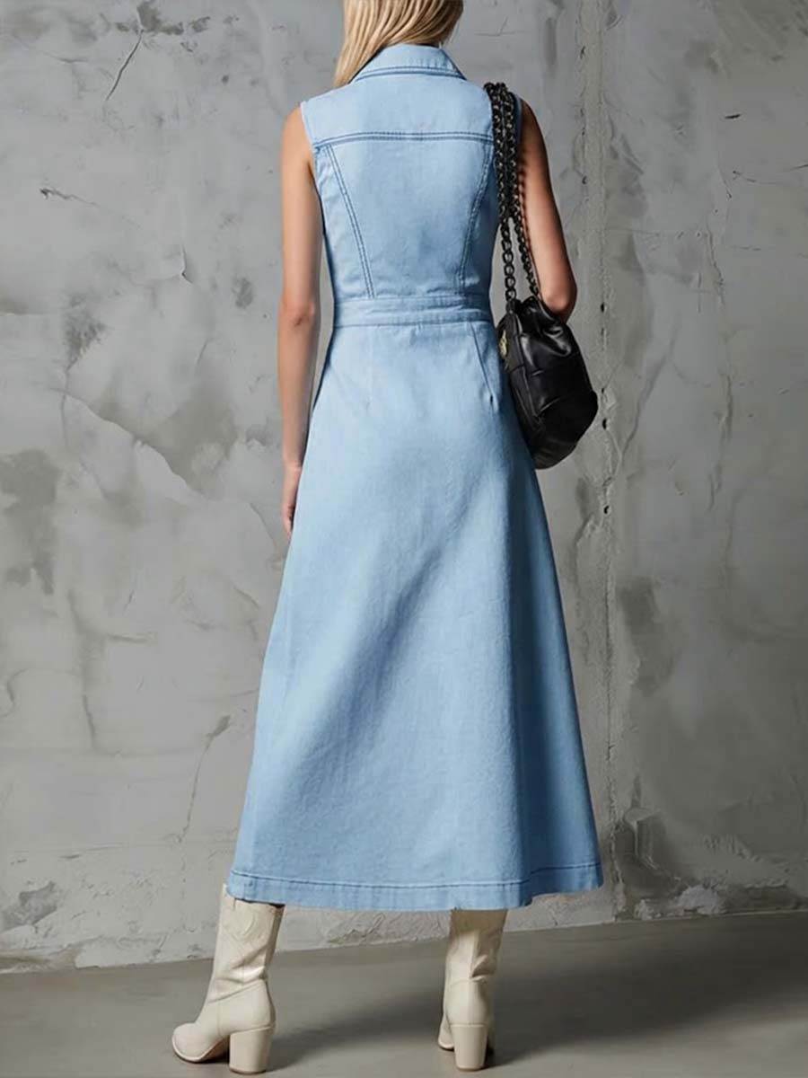 Women's Sleeveless Casual Loose Denim Dress With Lapel Collar