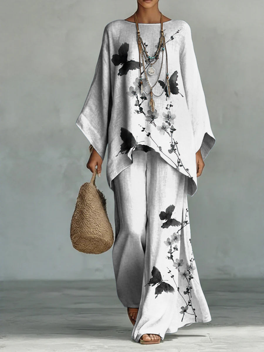 Oriental Elegant Floral And Butterfly Decorative Patterns Woman's Casual Long Sleeve Cotton Top And Pants
