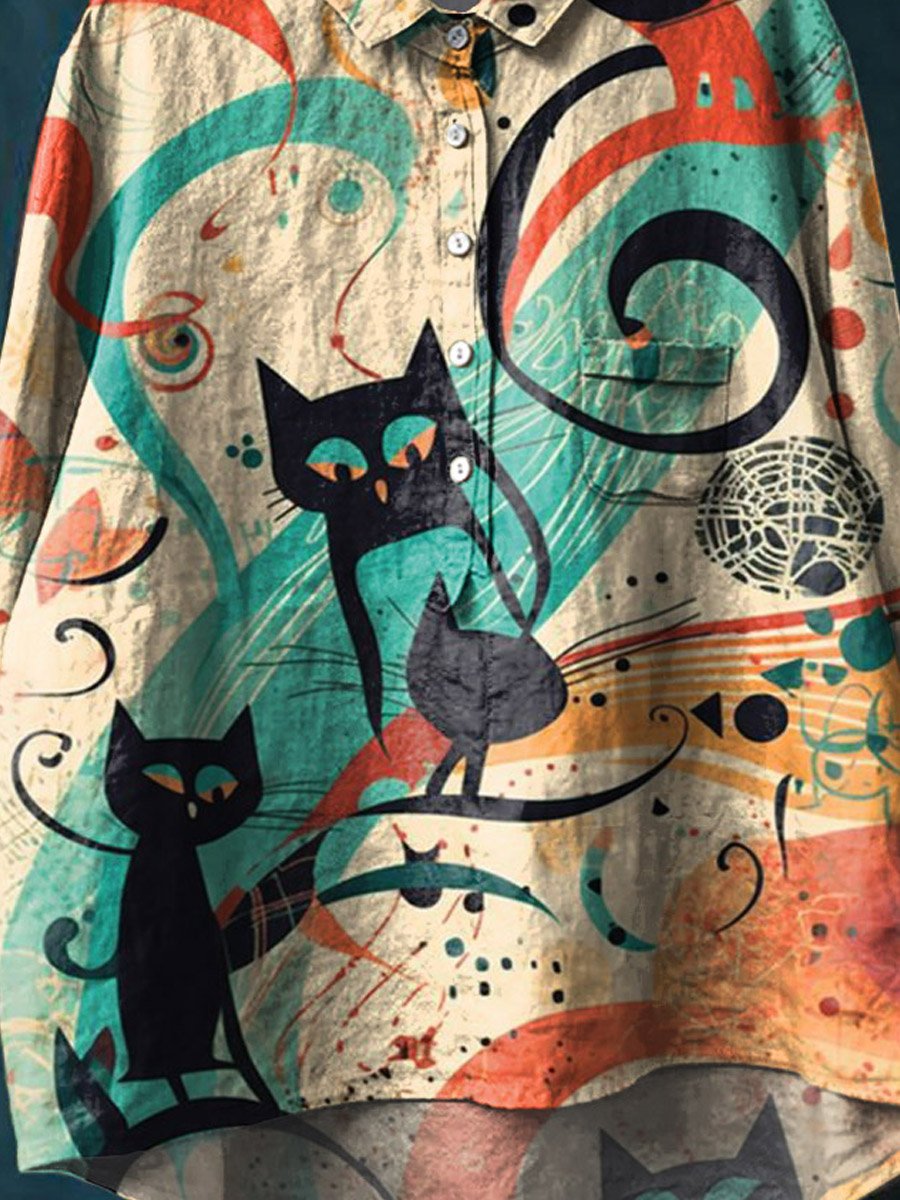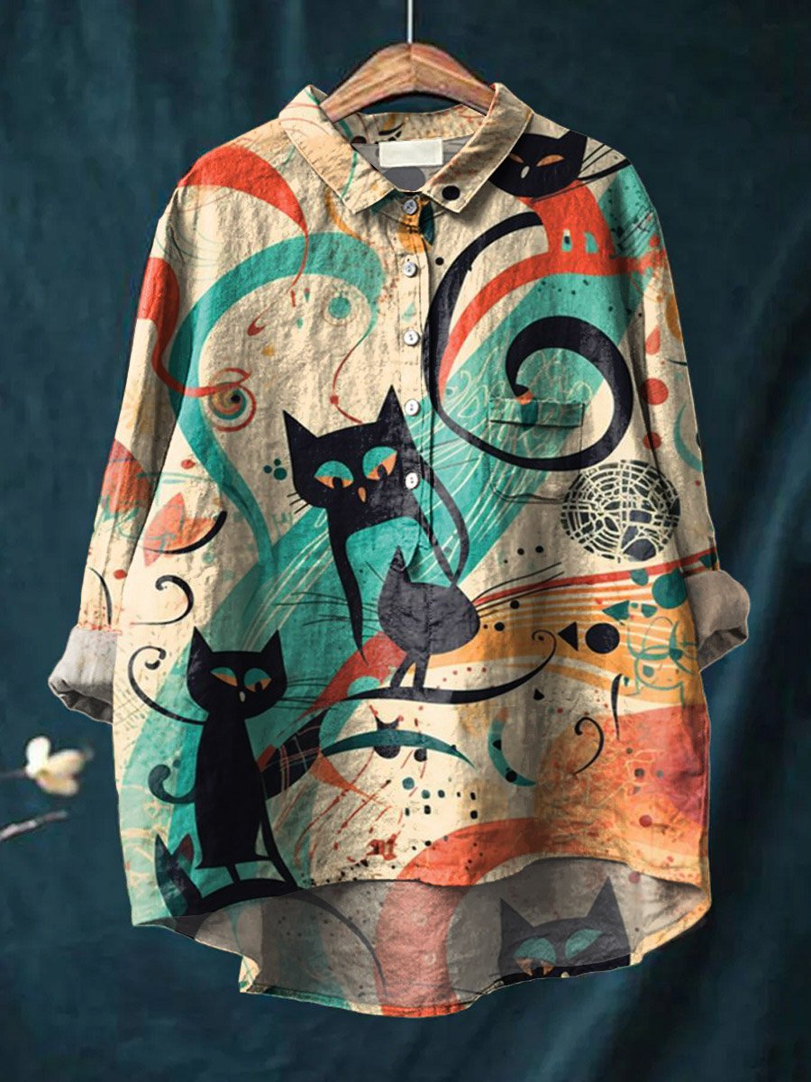 Vintage Funny Cats Art Print Casual Cotton And Linen Shirt