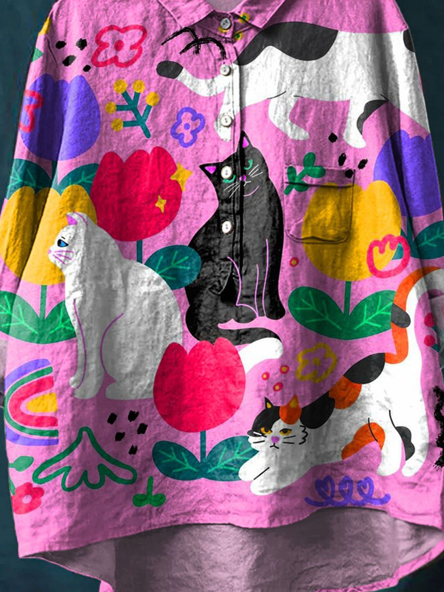 Vintage Lovely Cats Art Print Casual Cotton And Linen Shirt