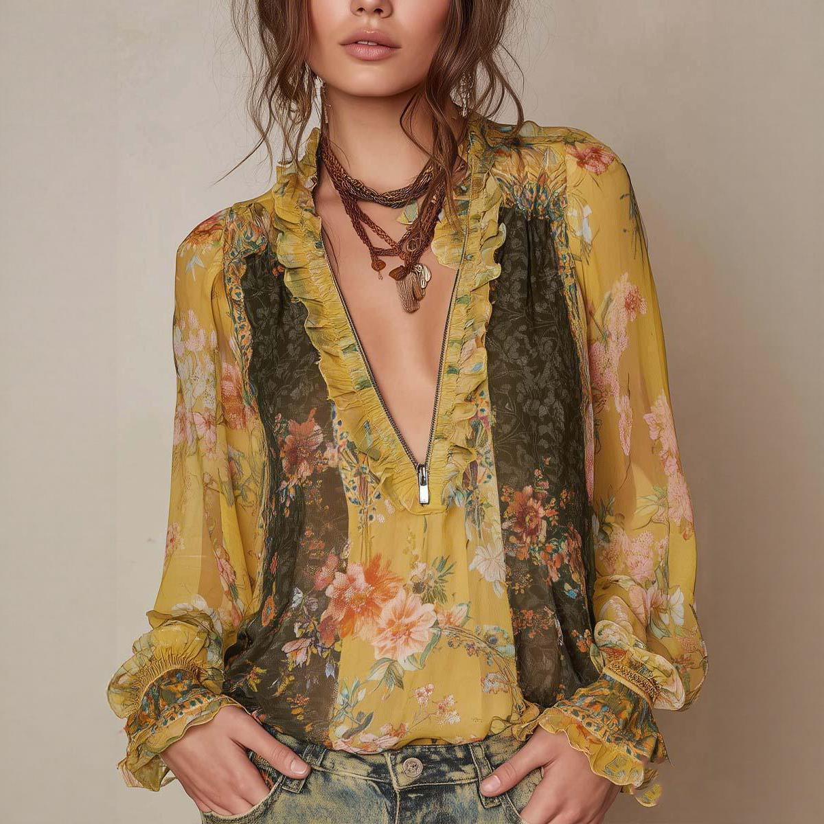Floral Print Chiffon Long Sleeve Blouse With Ruffle Trim And Zipper Detail