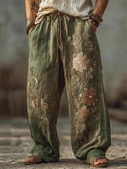 Men's Boho Floral Embroidered Wide Leg Linen Pants