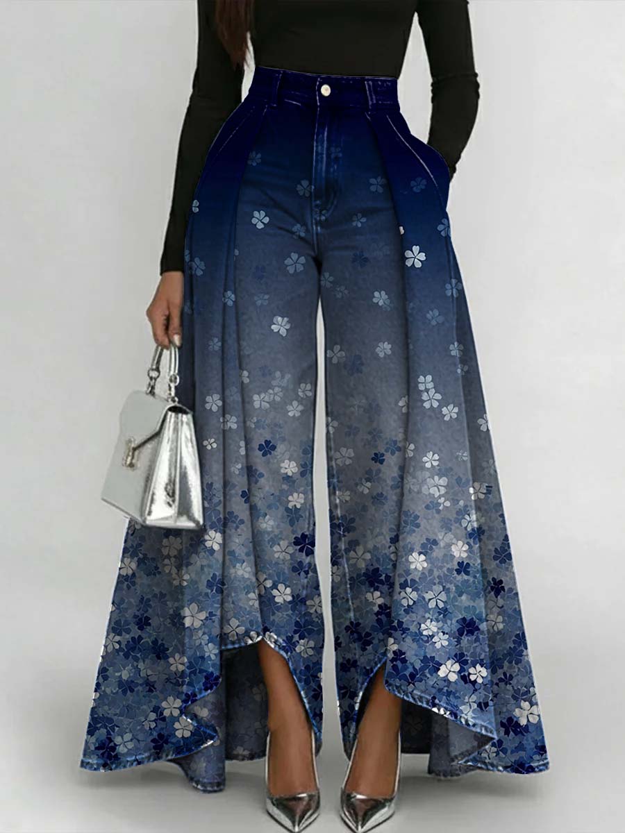 Women's Retro Flower Art Print Casual High-waist Loose Jeans