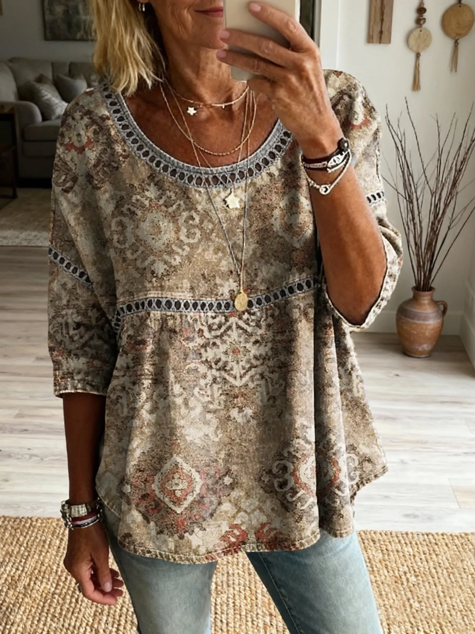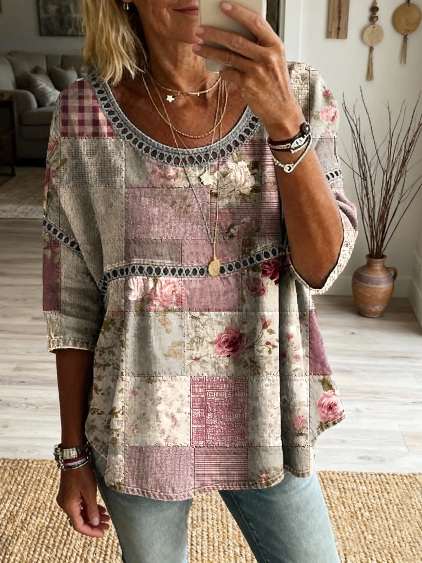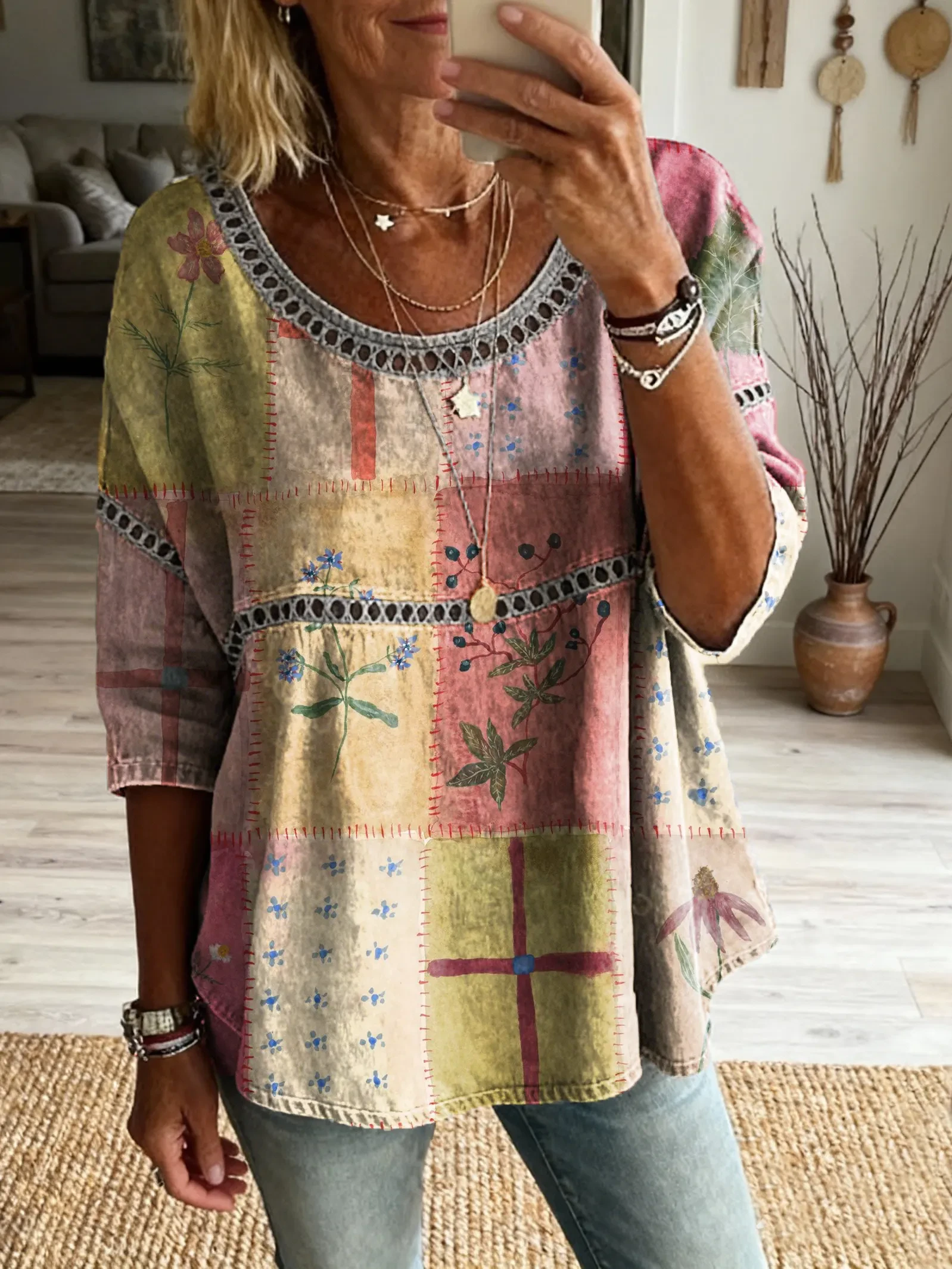 Women's Vintage Patchwork Textured Art Print Casual Round Neck Cutout Top