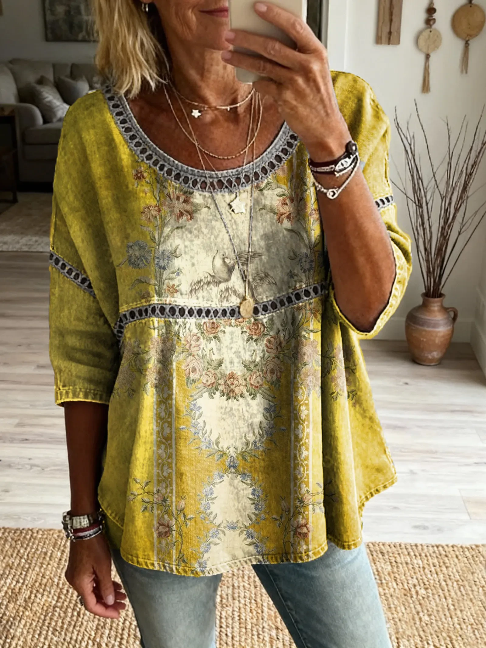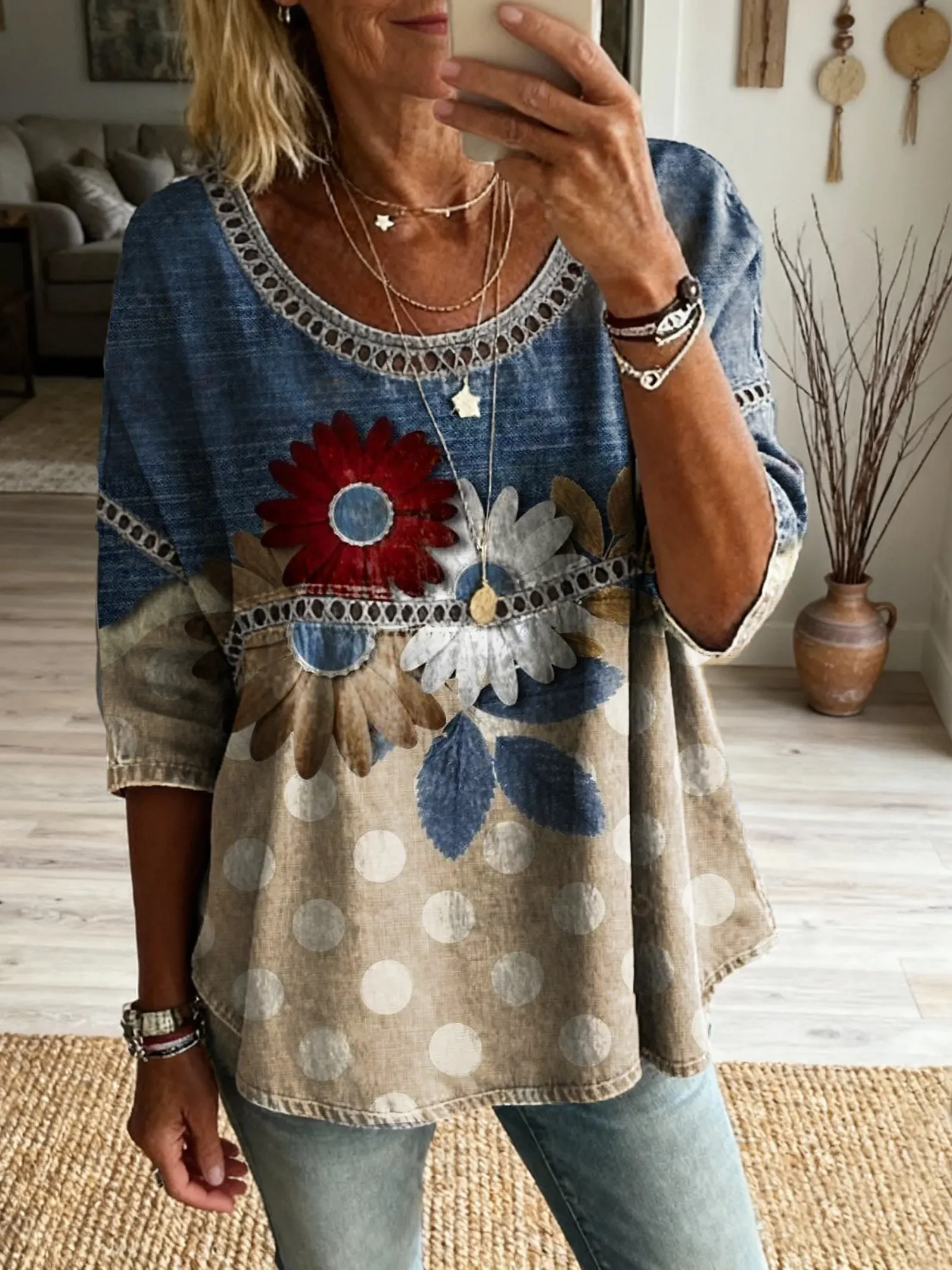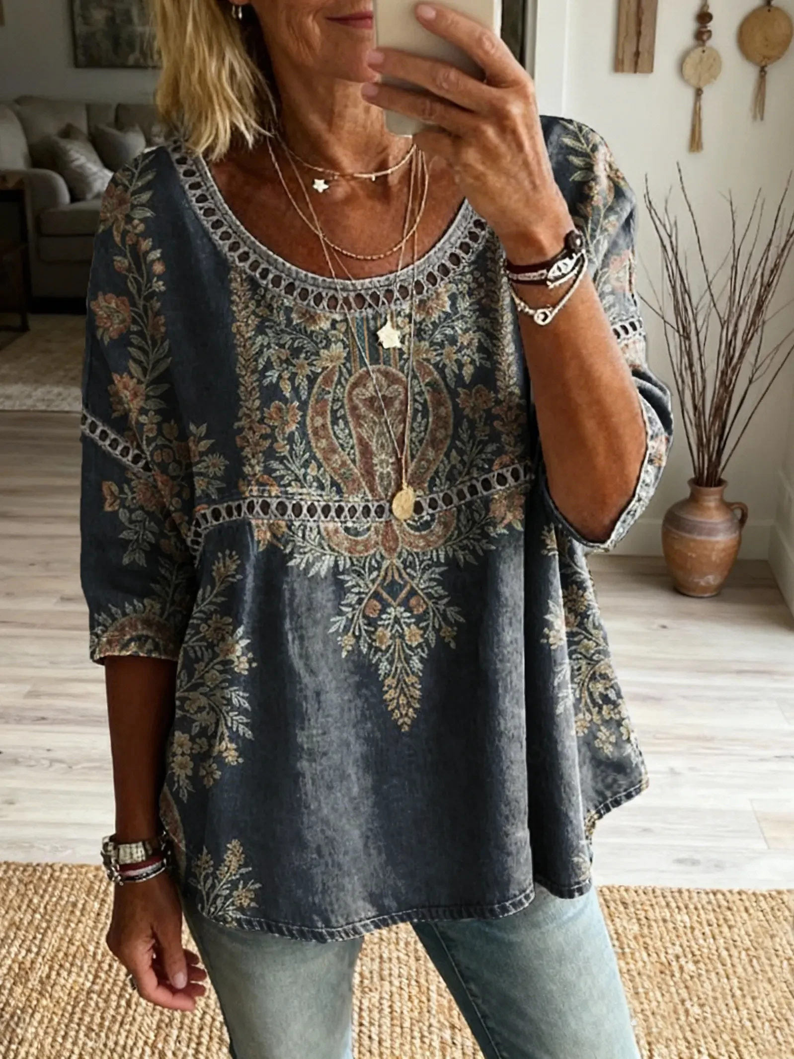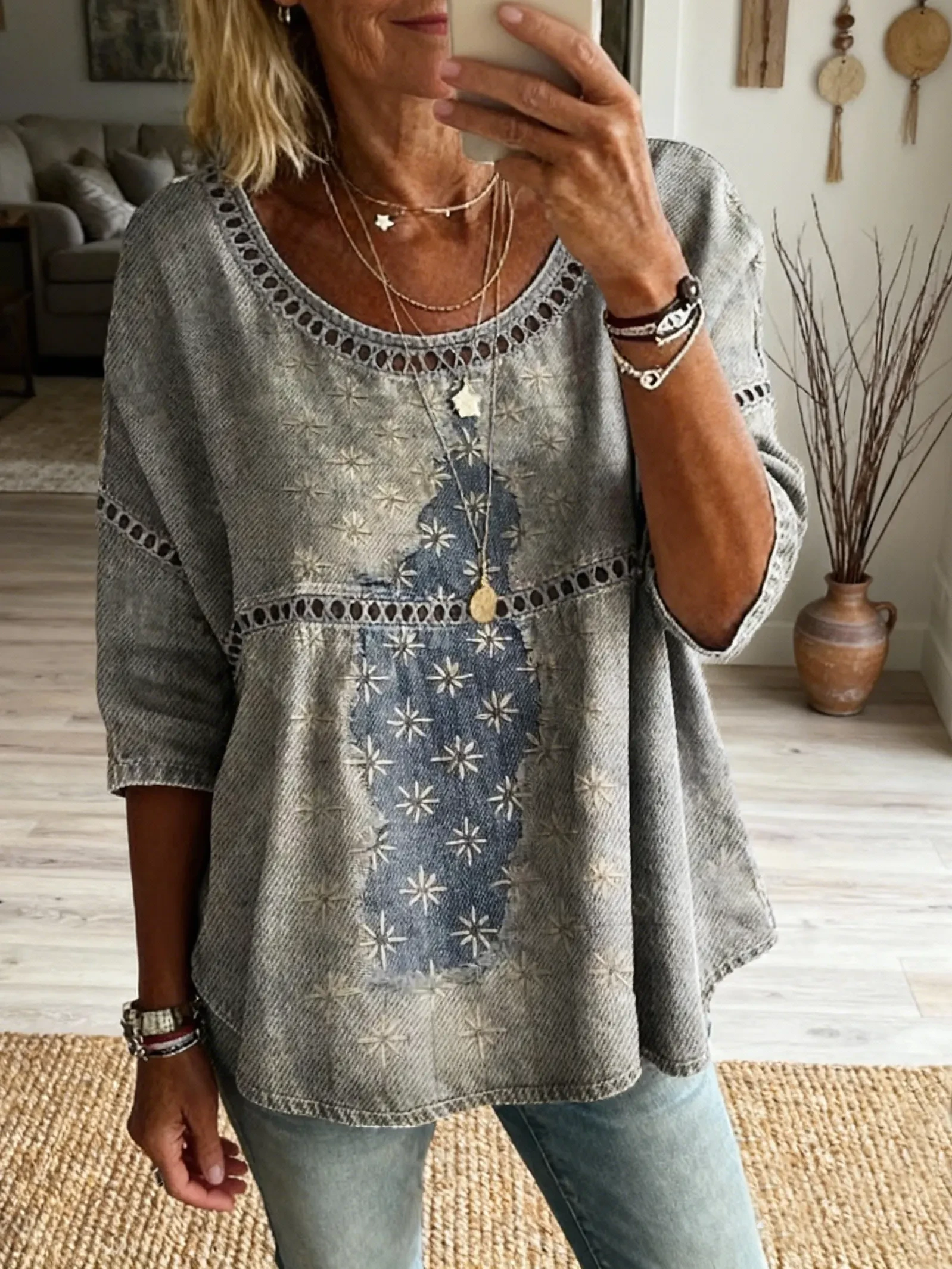 Women's Vintage Patchwork Textured Art Print Casual Round Neck Cutout Top