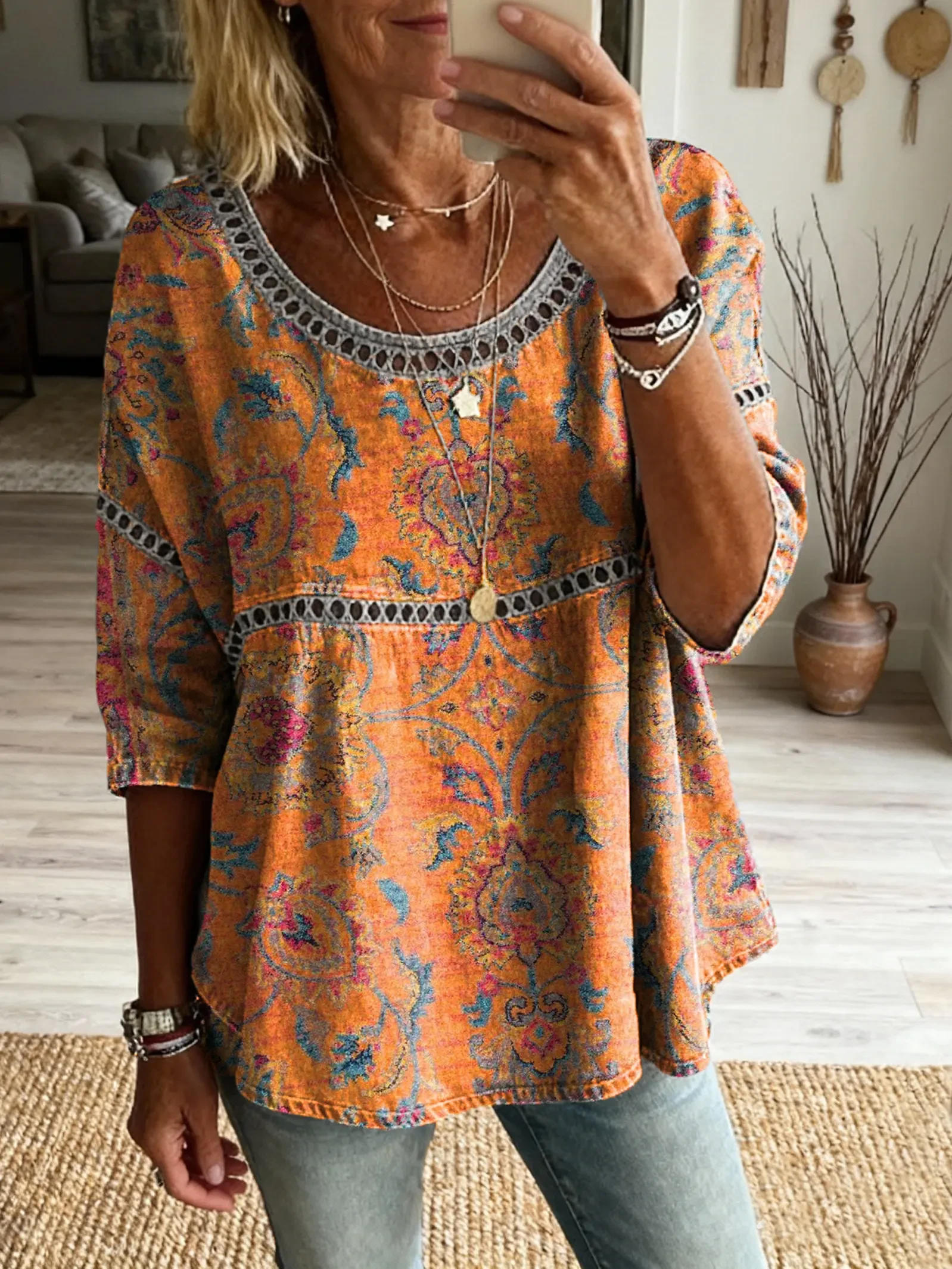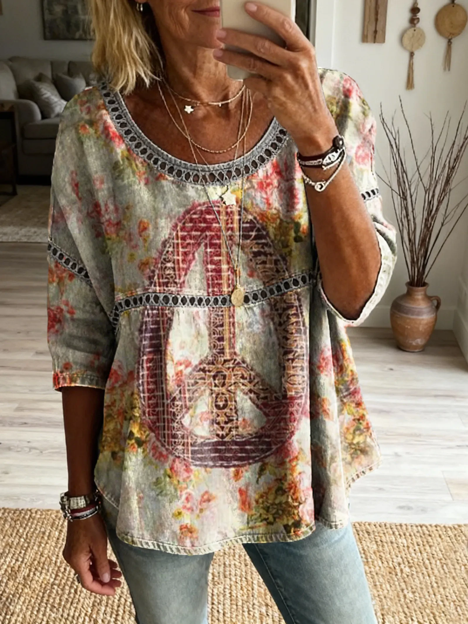 Women's Vintage Hippie Pattern Art Print Casual Round Neck Cutout Top
