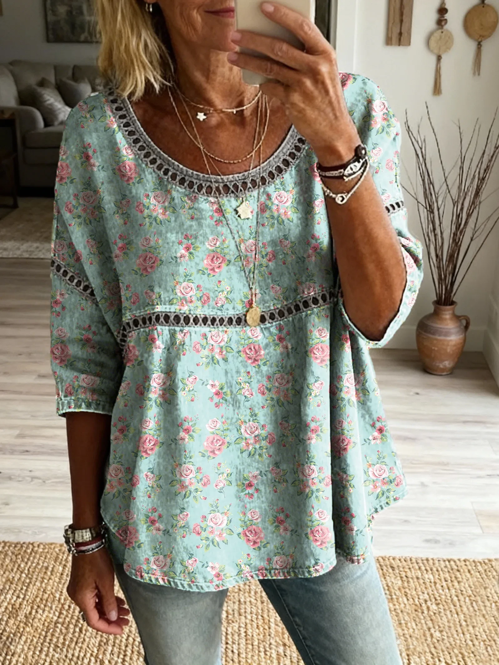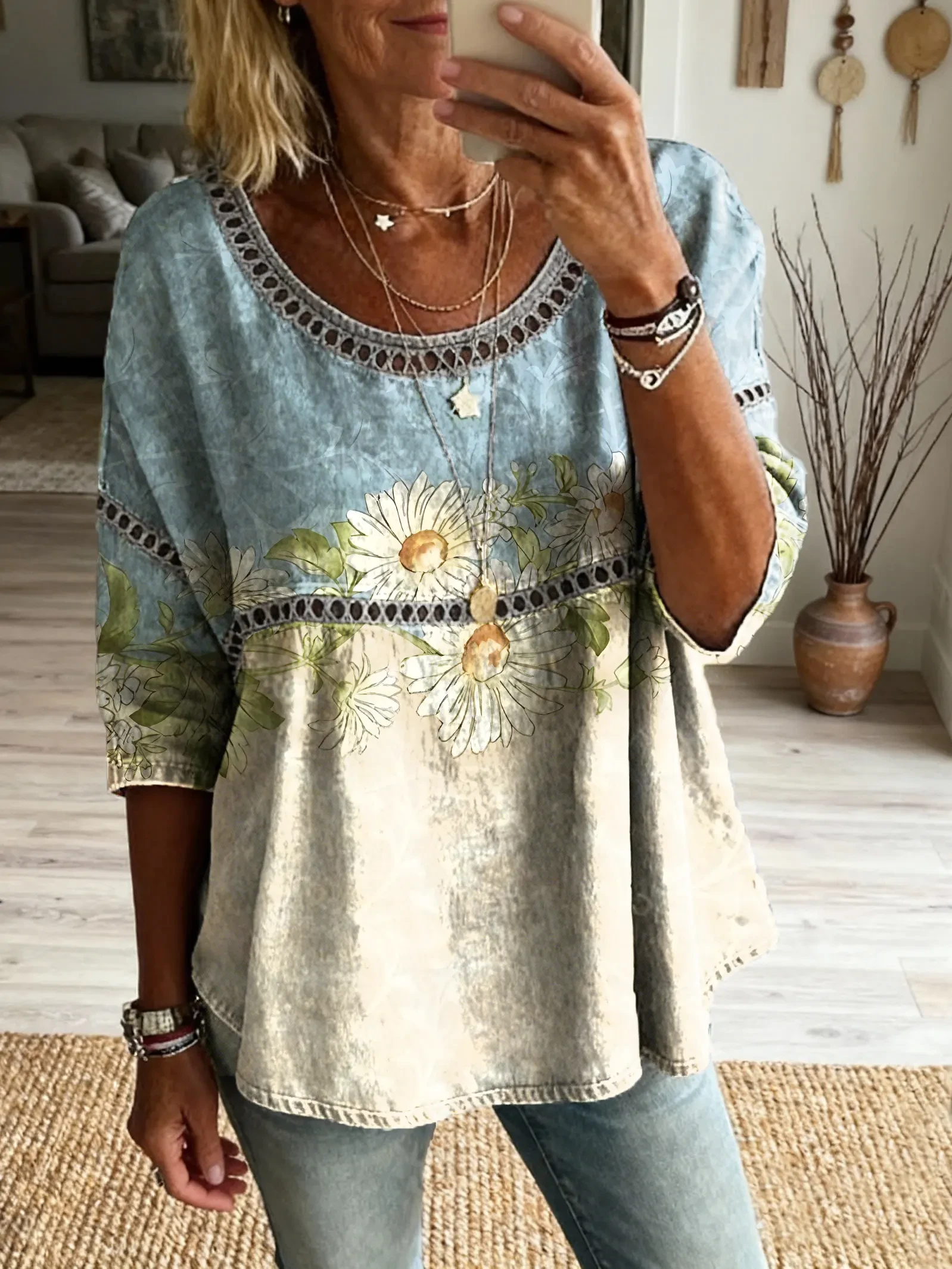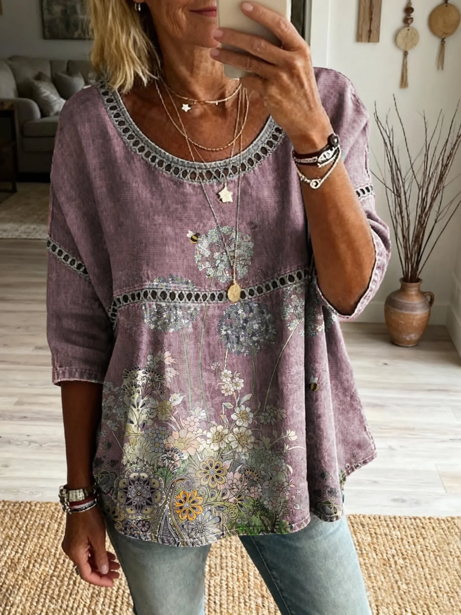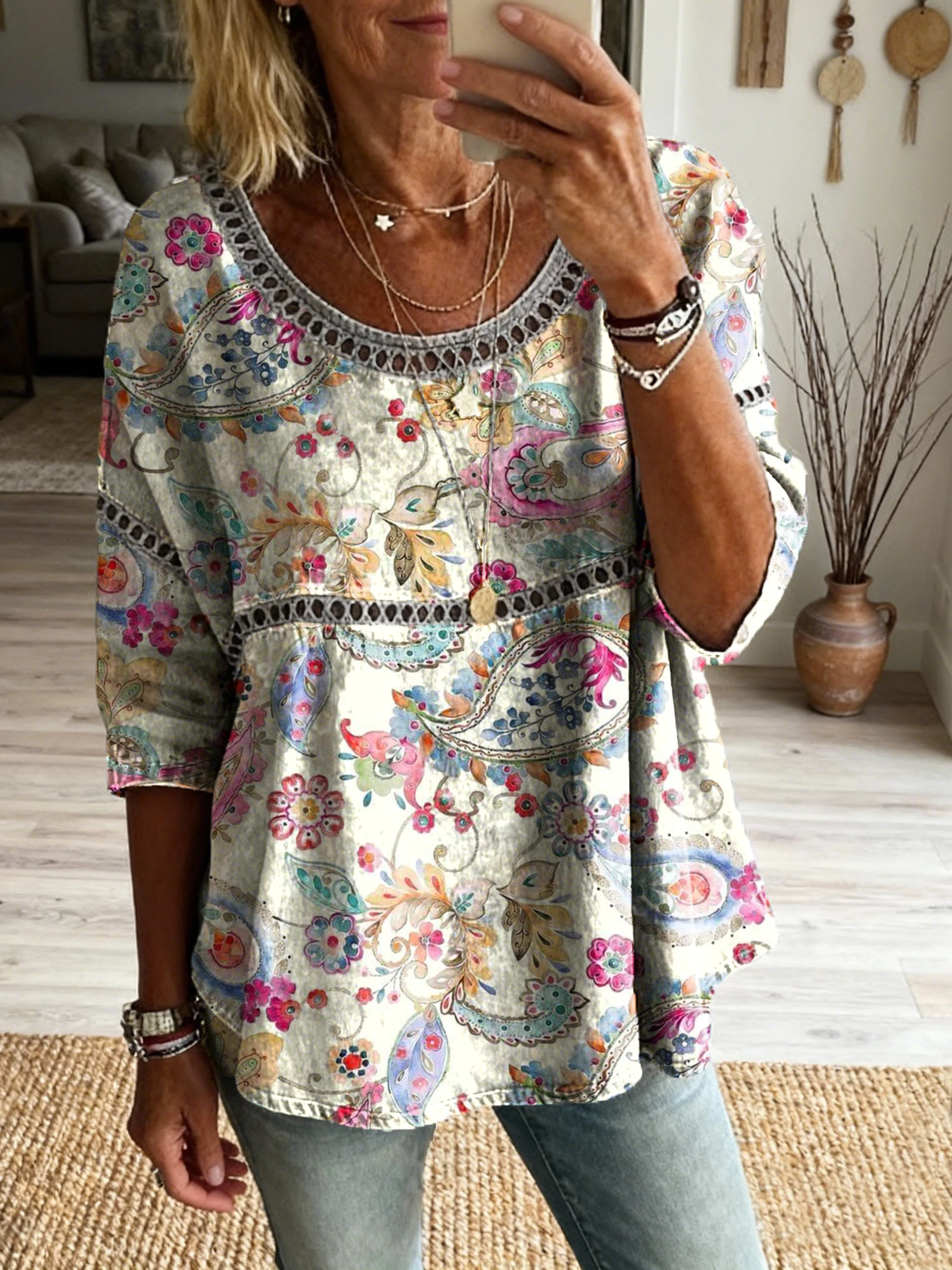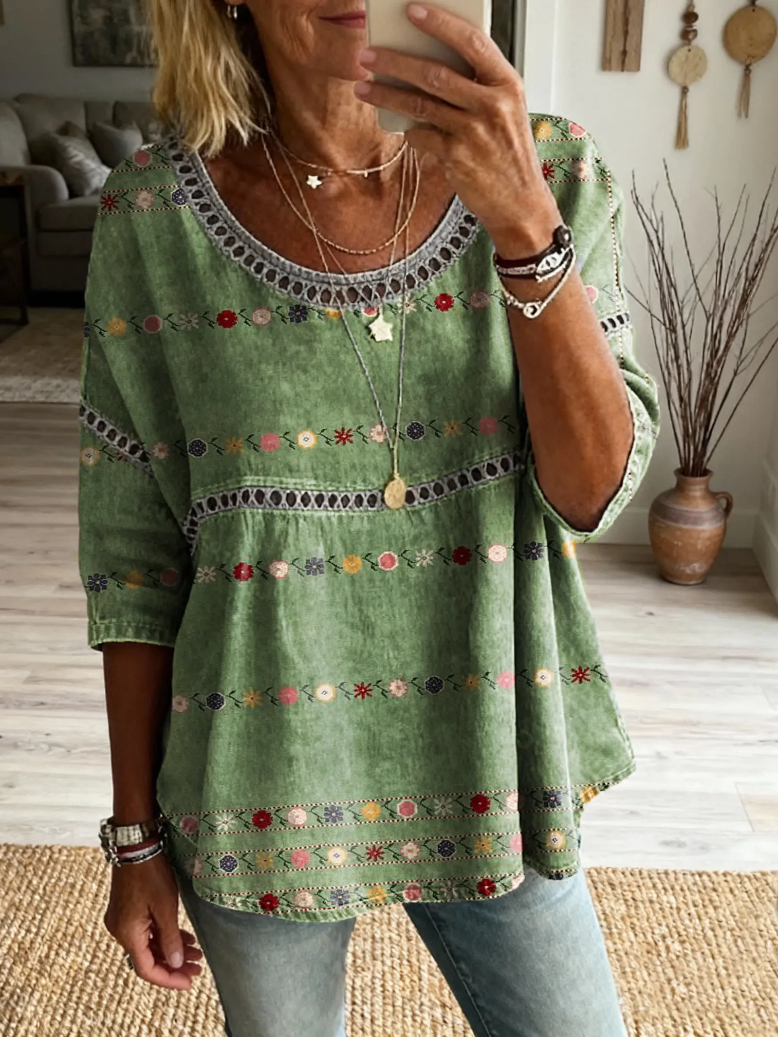 Ethnicity Patchwork Flowers Women's Vintage Art Print Casual Round Neck Cutout Top