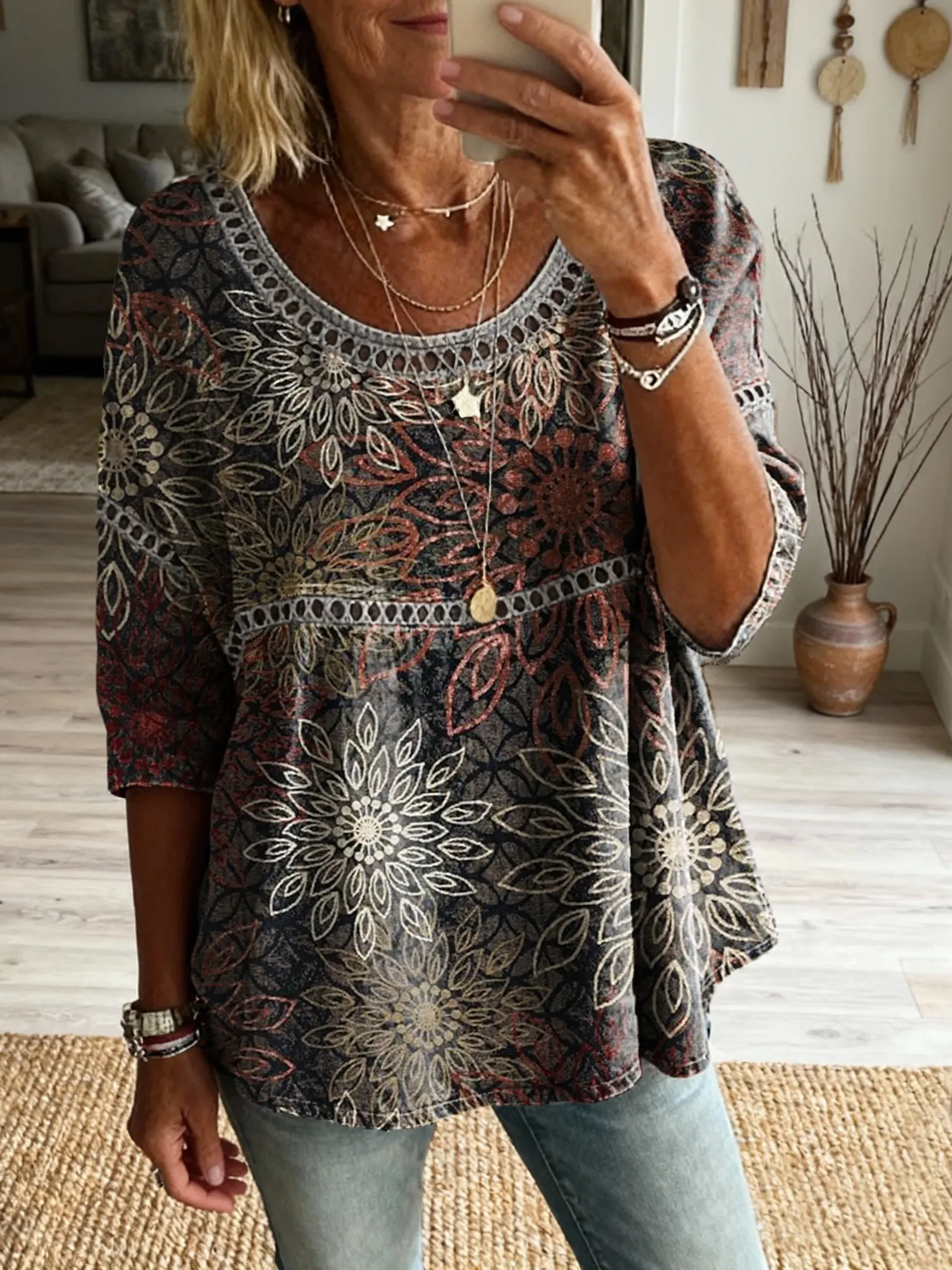 Ethnicity Geometry Flowers Women's Vintage Art Print Casual Round Neck Cutout Top