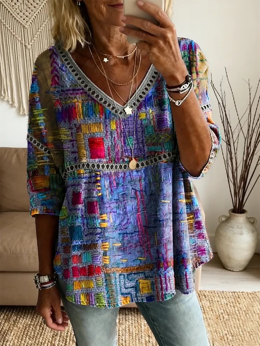 Ethnicity Geometry Texture Women's Vintage Art Print Casual V Neck Cutout Top