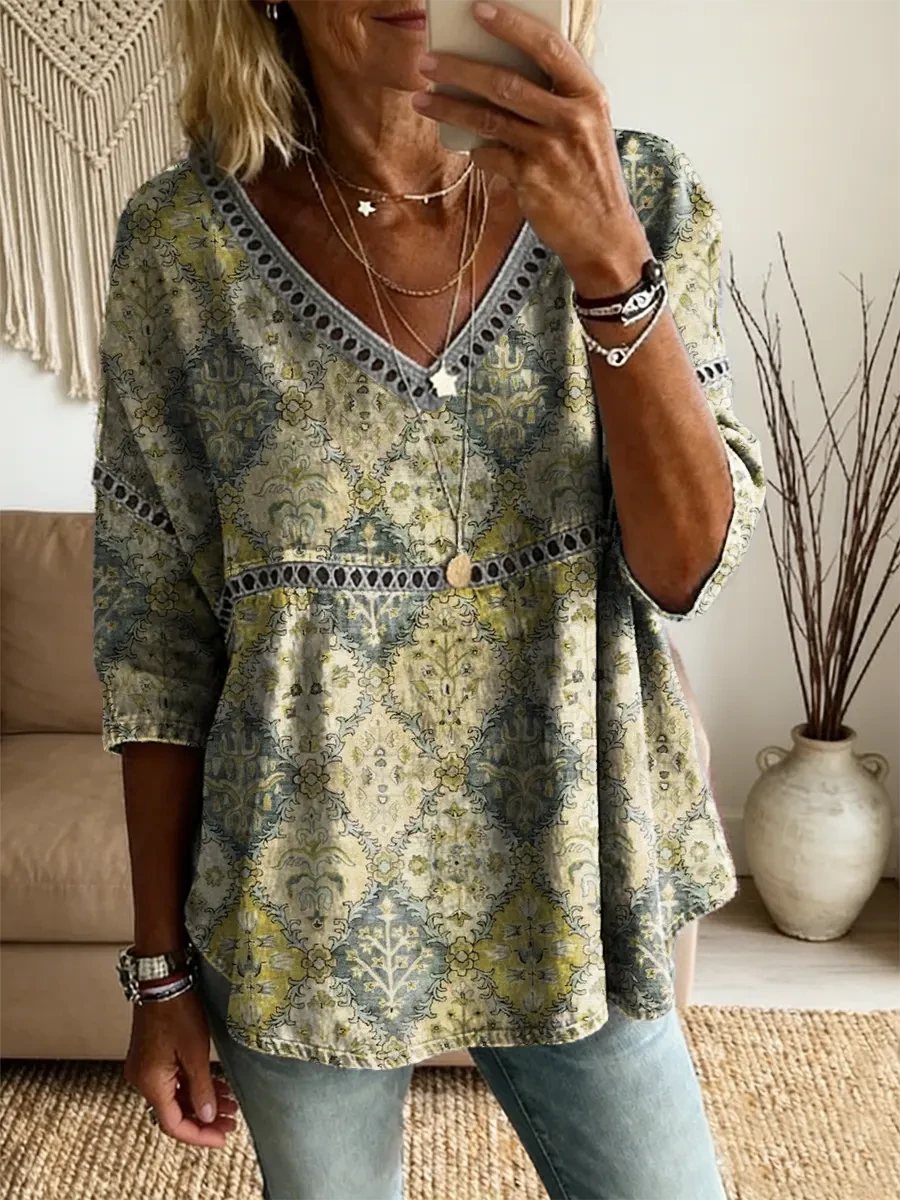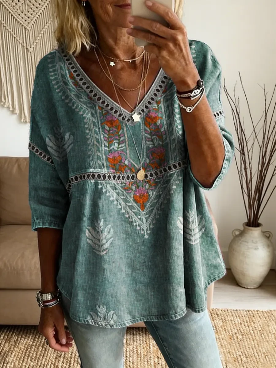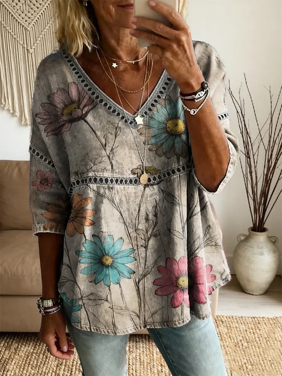 Vintage Bohemia Flowers Women's Art Print Casual V Neck Cutout Top