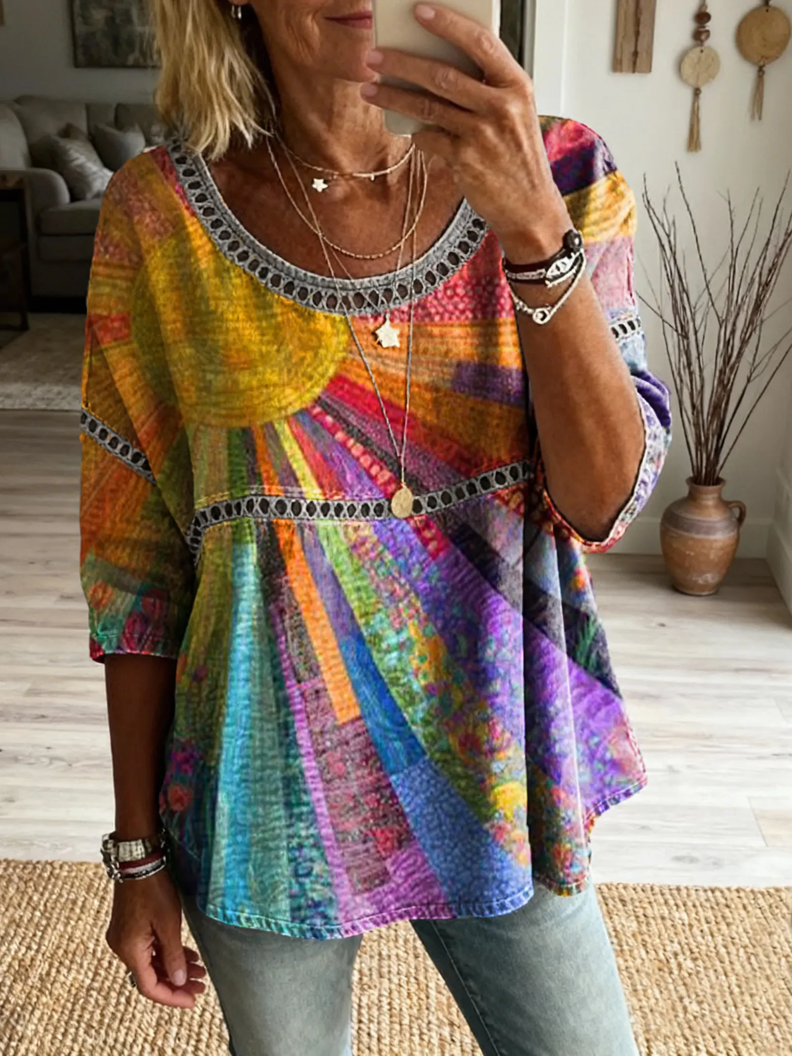 Women's Vintage Patchwork Colorful Sun Art Print Casual Round Neck Cutout Top