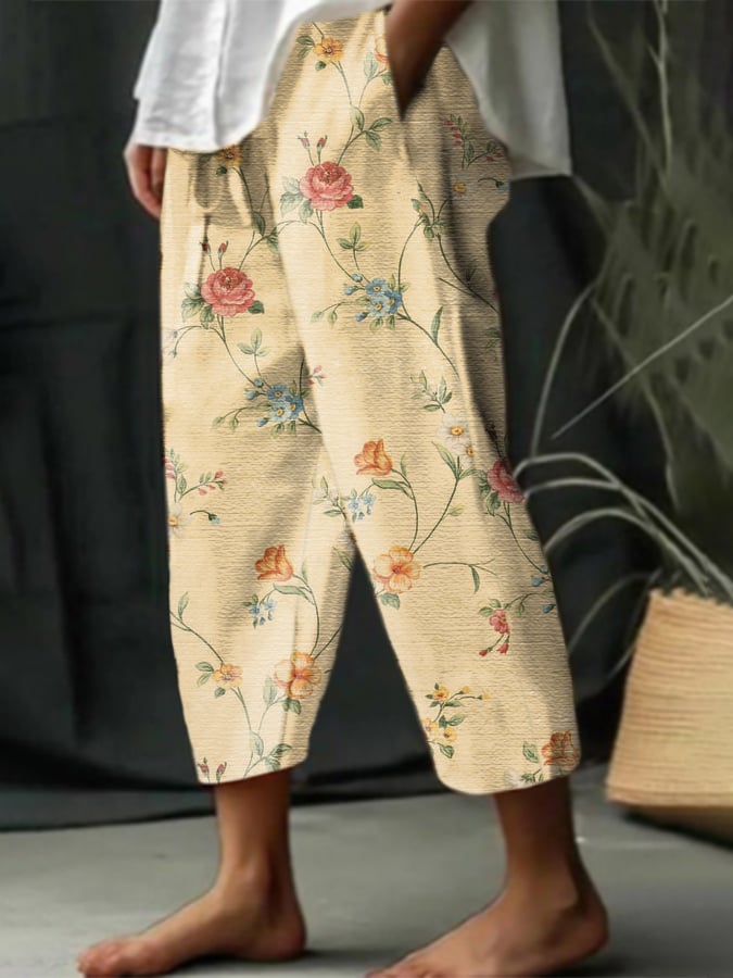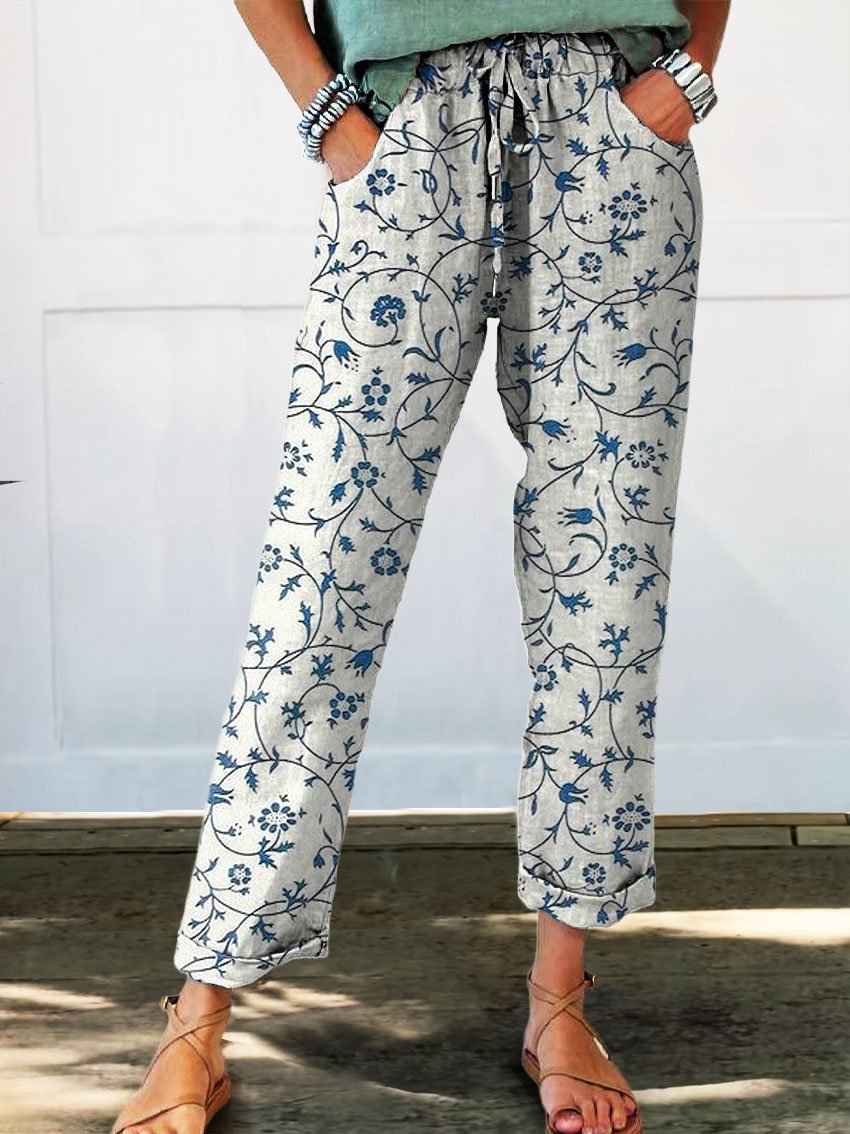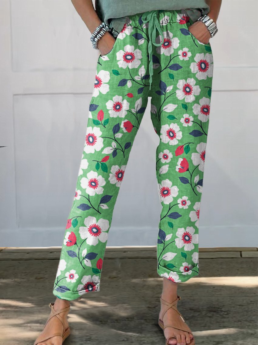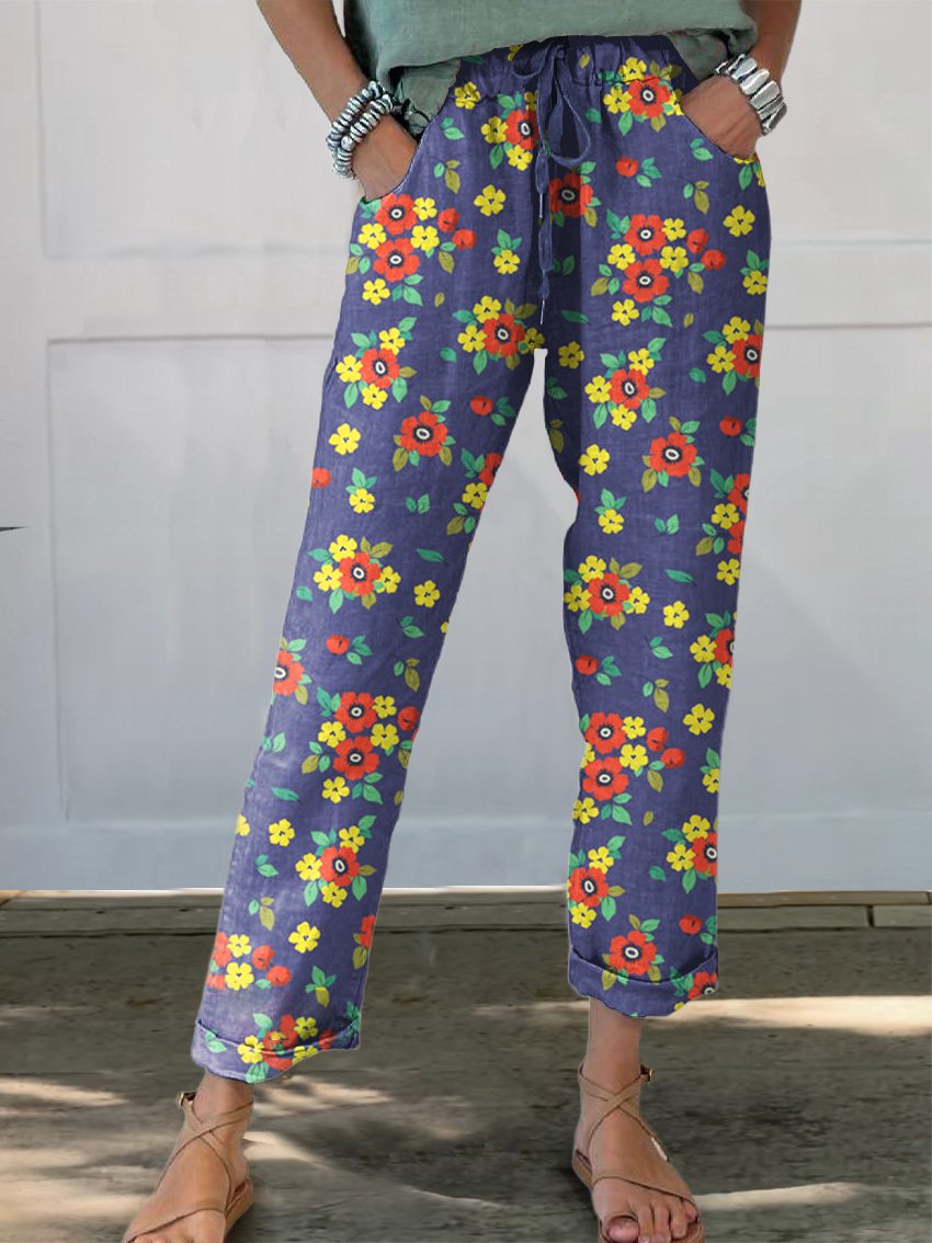 Women's Vintage Lovely Floral Art Printed Cotton And Linen Casual Pants