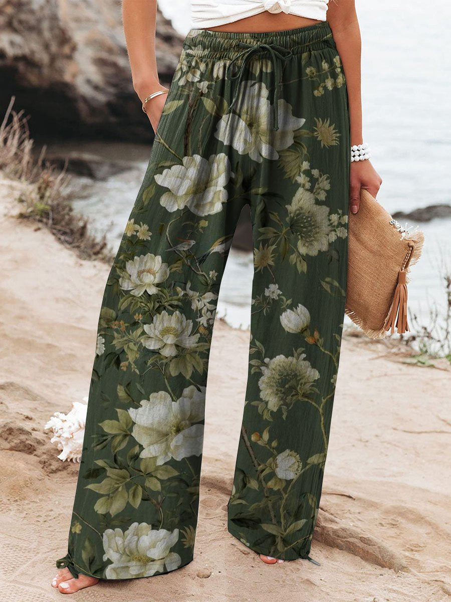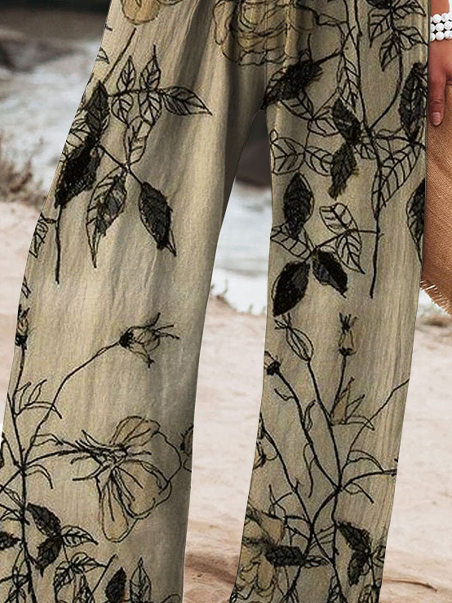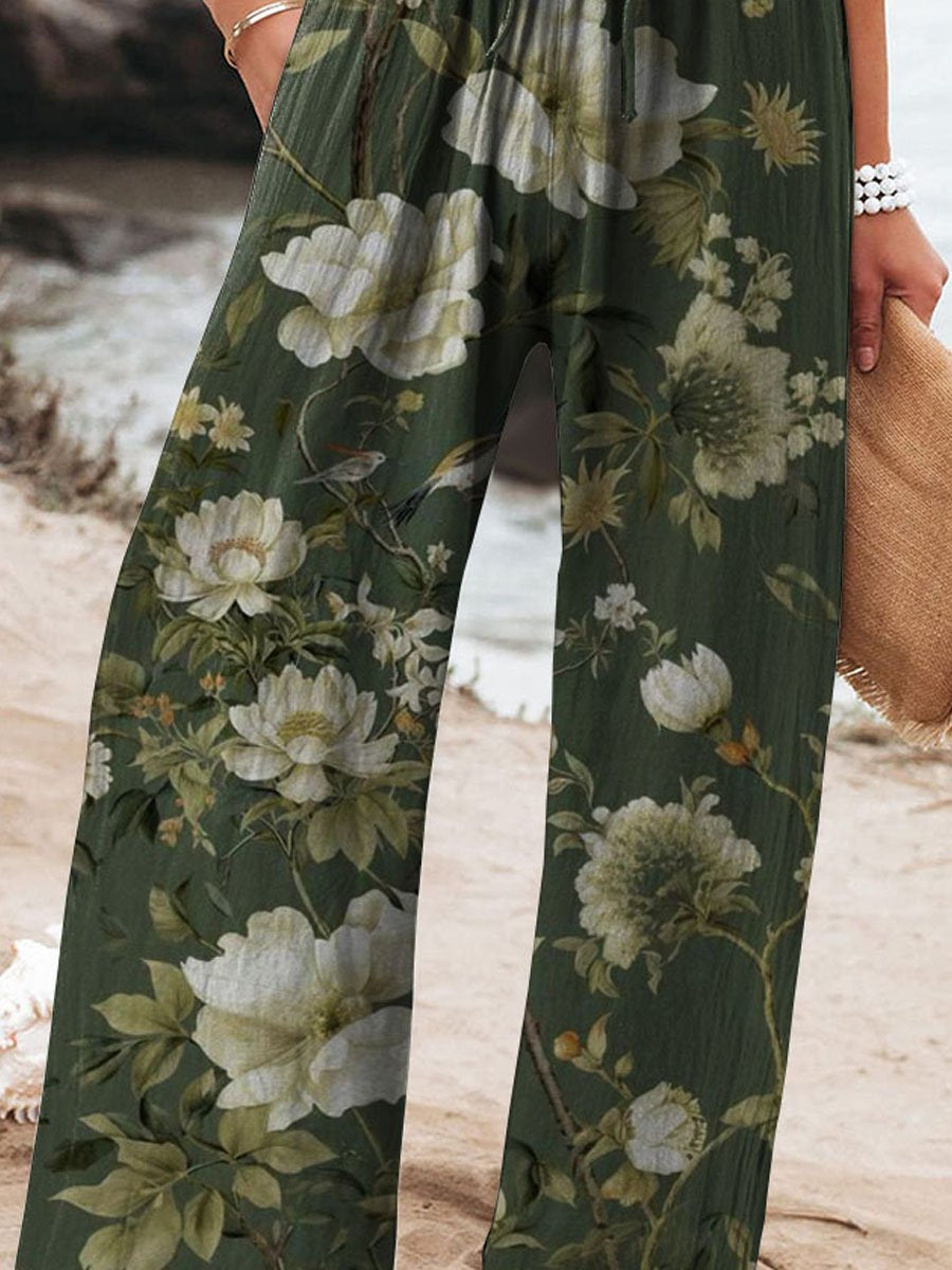 Women's Vintage Lovely Floral Art Printed Cotton And Linen Casual Pants