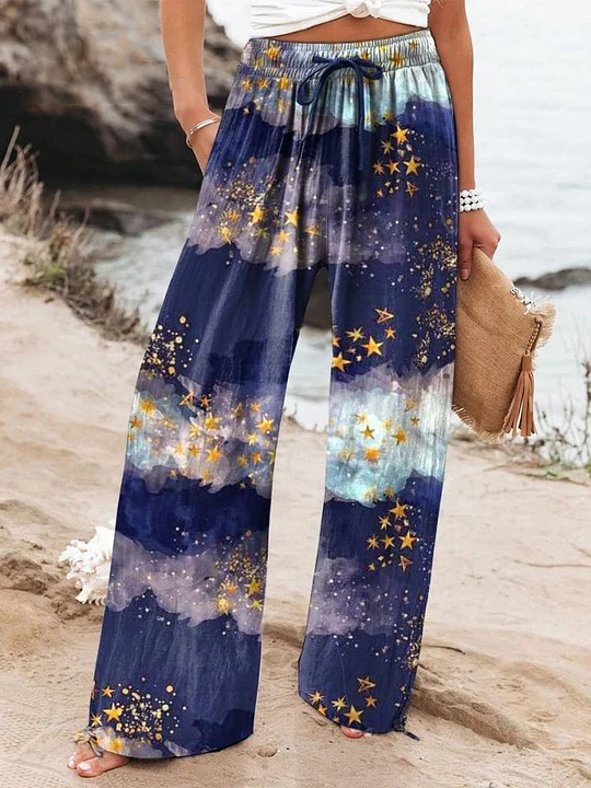 Women's Vacation Deep Purple Night Sky Nebula Art Printed Cotton And Linen Casual Pants