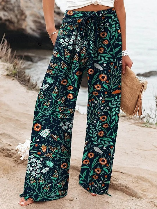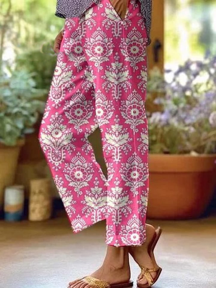 Women's Vintage Floral Art Printed Cotton And Linen Casual Pants