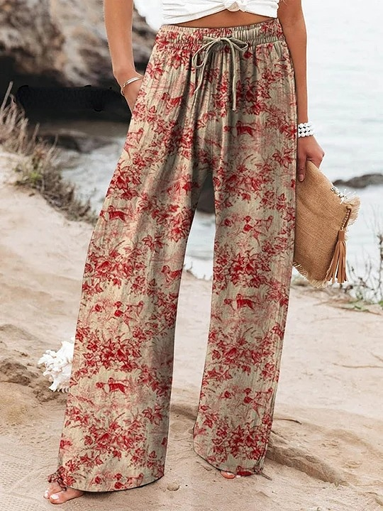 Women's Vintage Lovely Floral Dogs Art Printed Cotton And Linen Casual Pants
