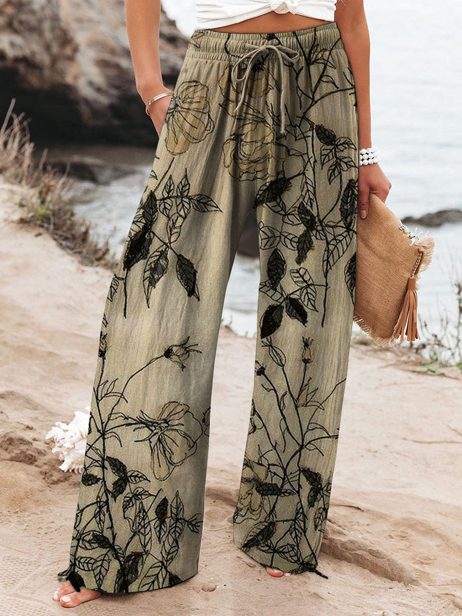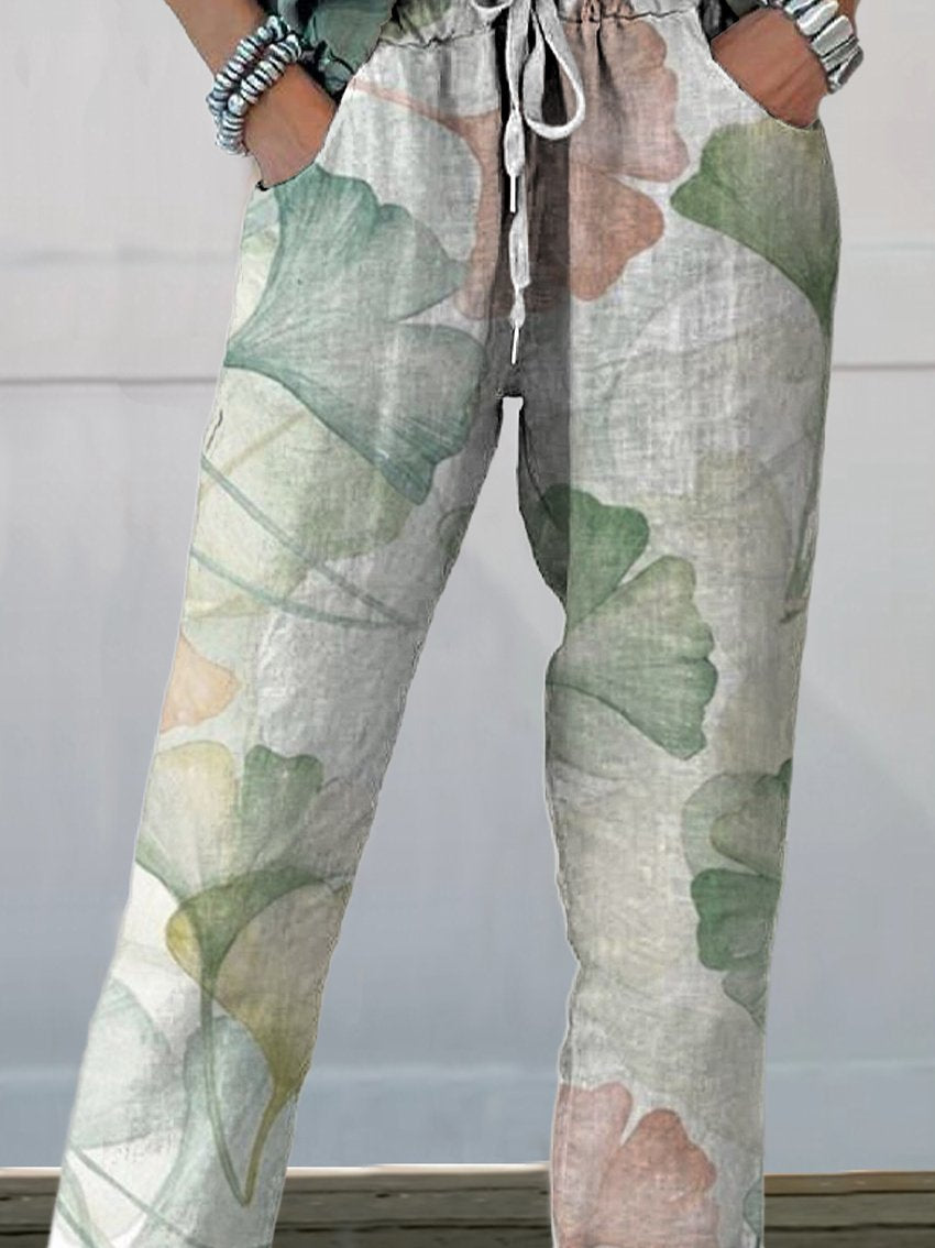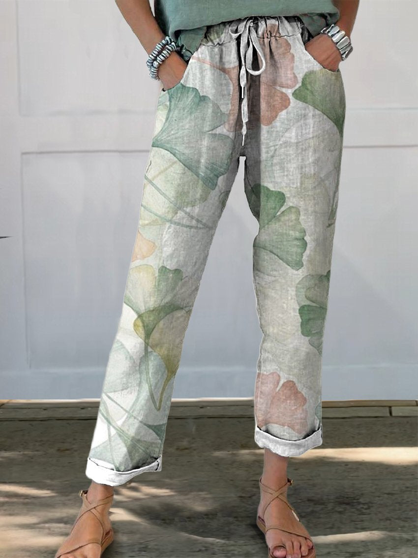 Women's Vintage Leaves Floral Printed Cotton And Linen Casual Pants