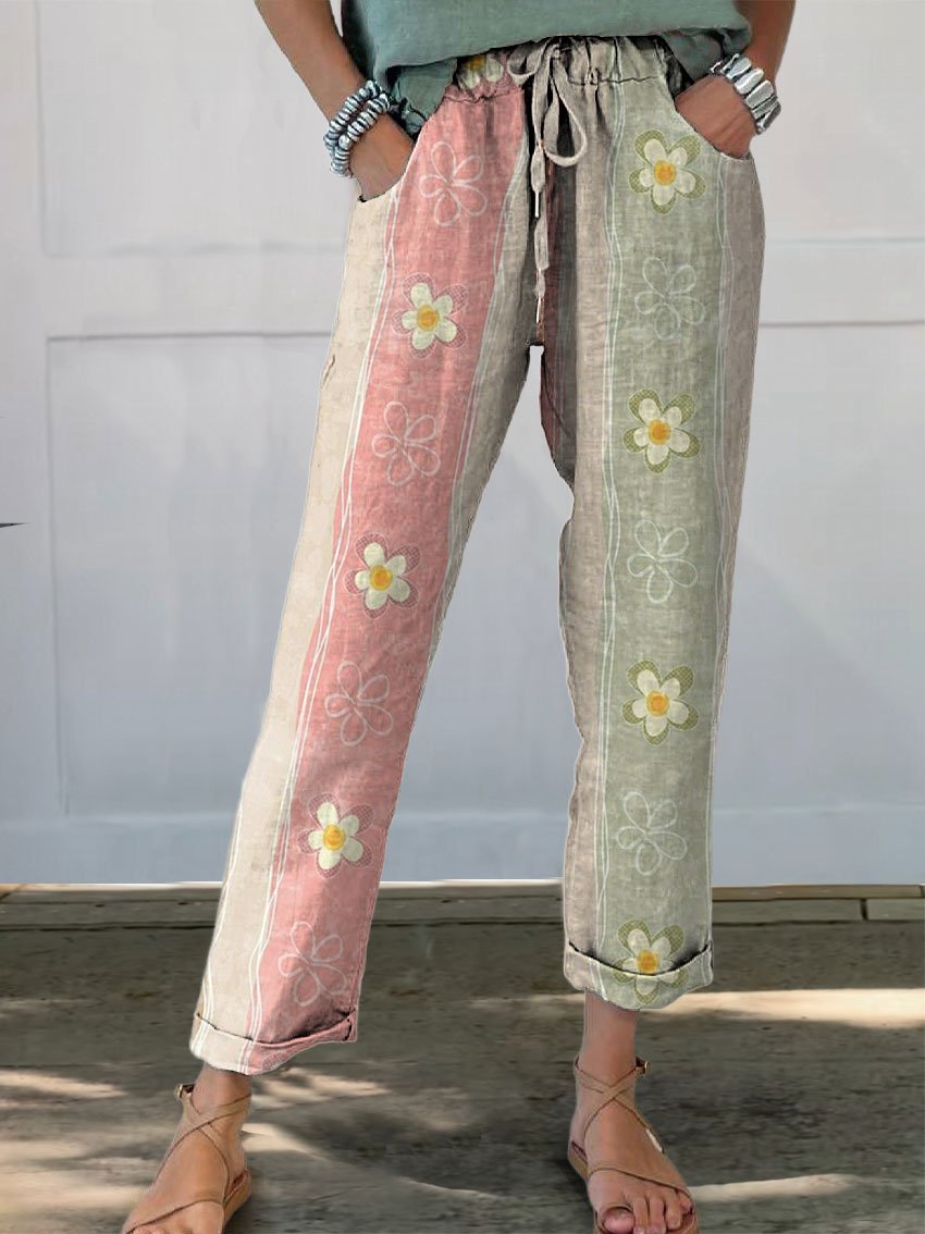 Women's Daisy Art Printed Cotton And Linen Casual Pants