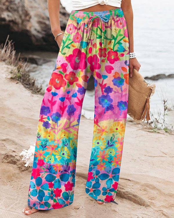 Women's Art Floral Print Cotton And Linen Casual Pants