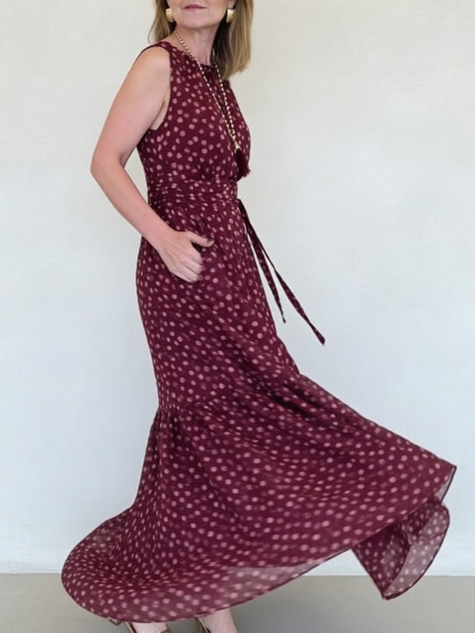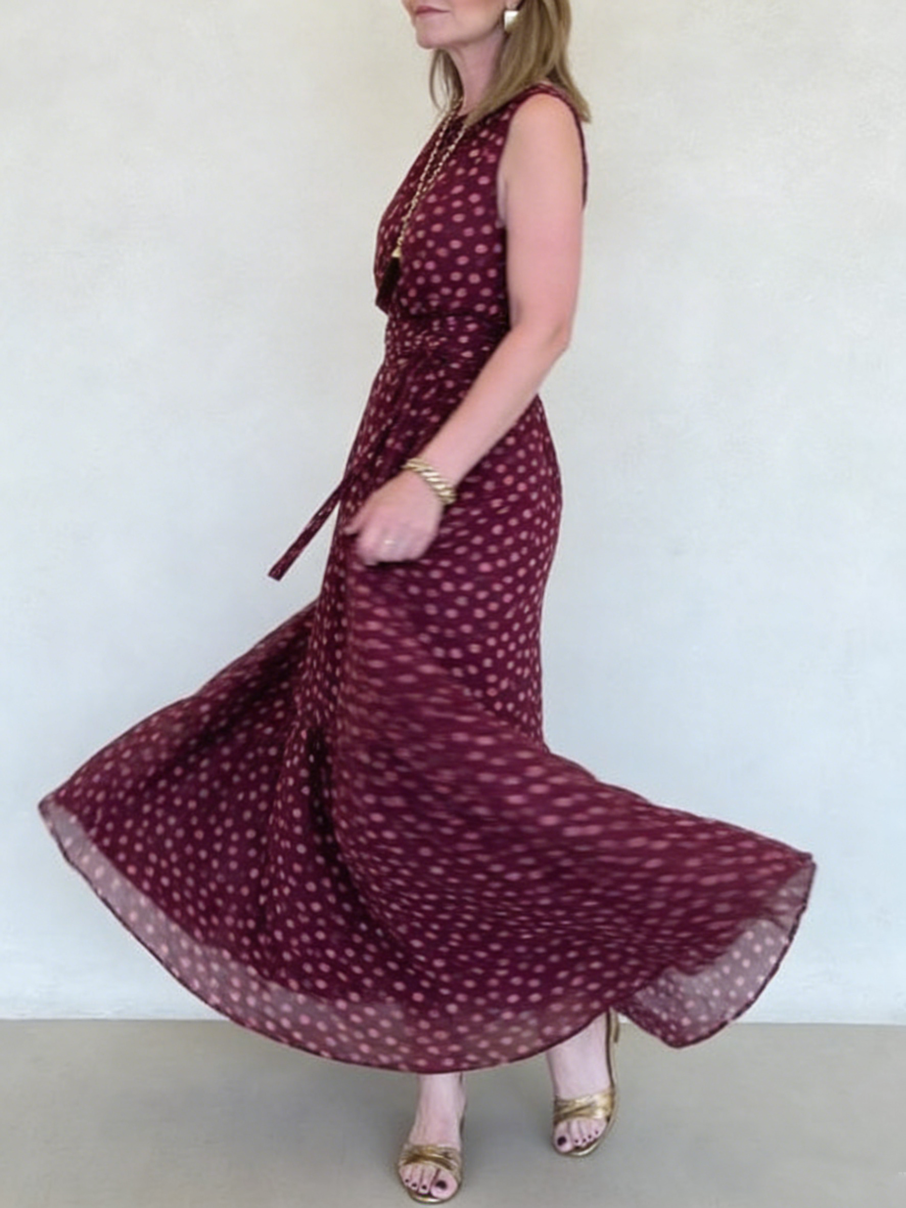 Elegant Polka Dot Print Belted Maxi Dress