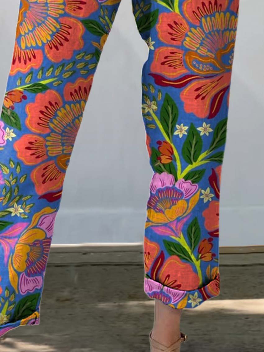 Women's Artistic Flowers Printed Cotton And Linen Casual Pants