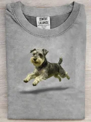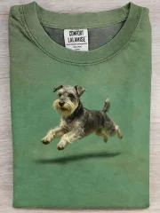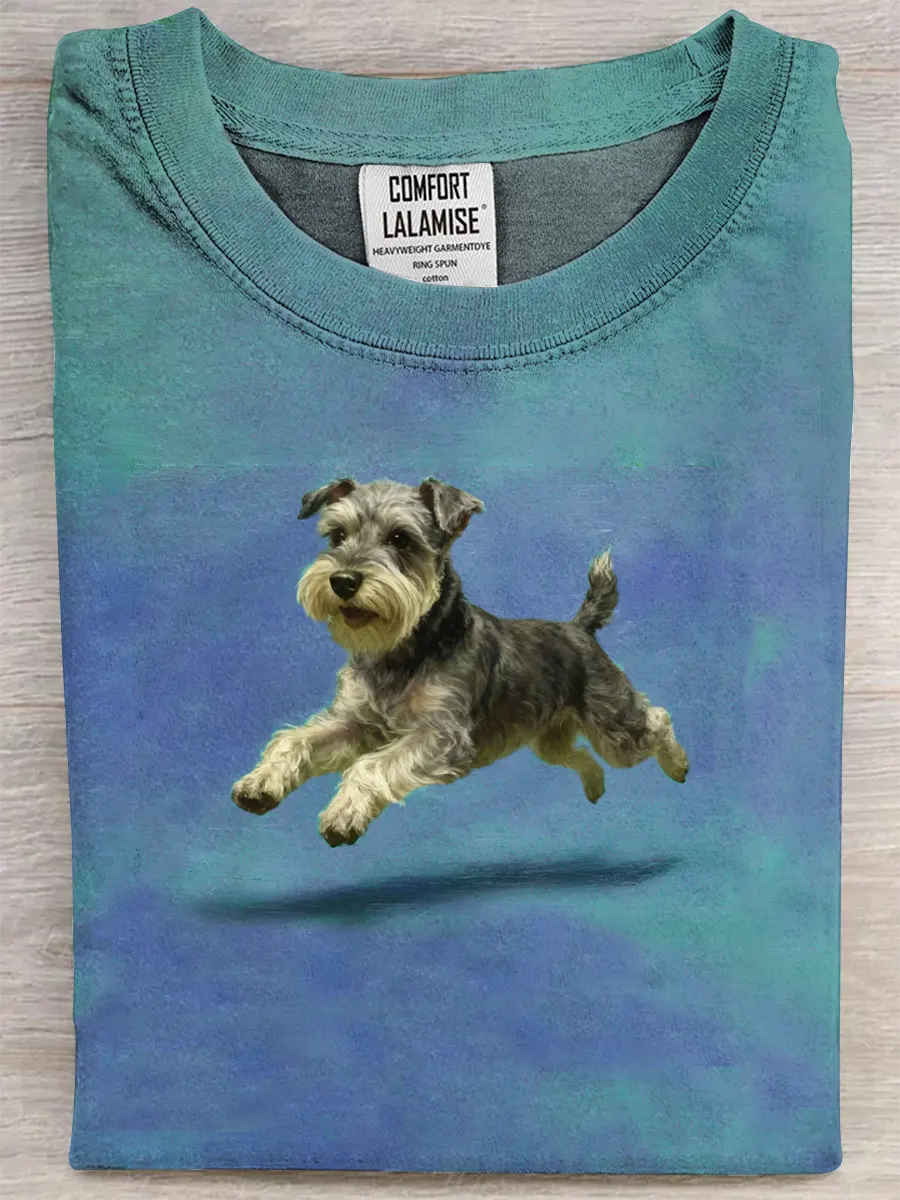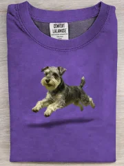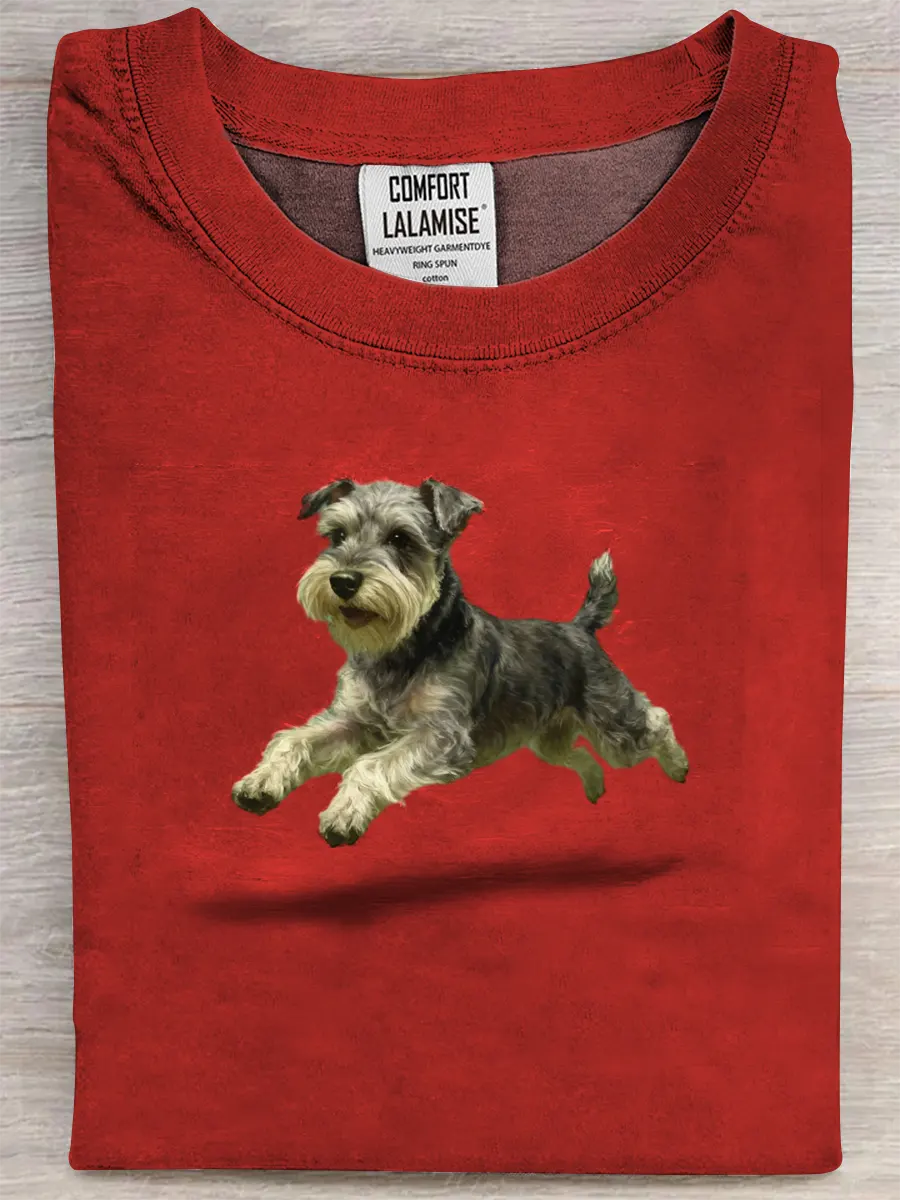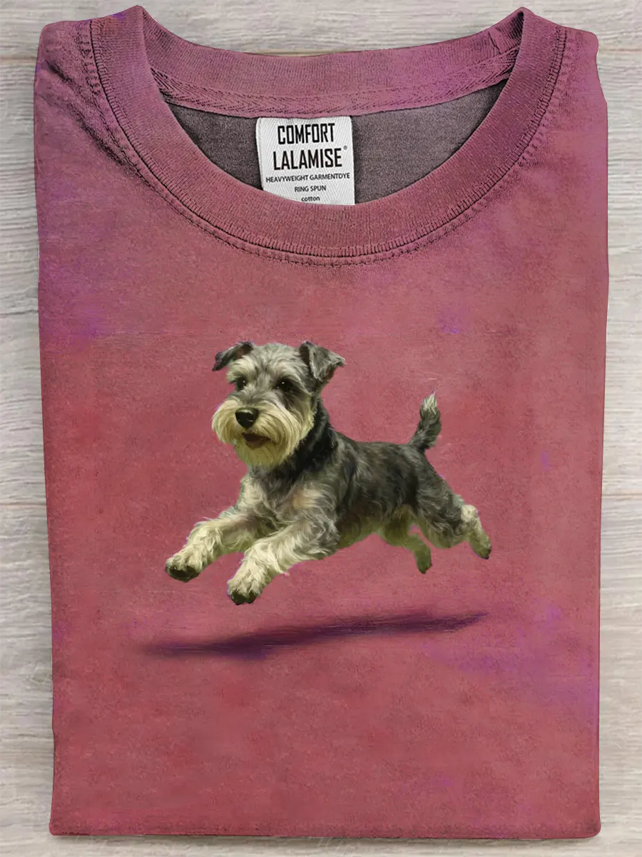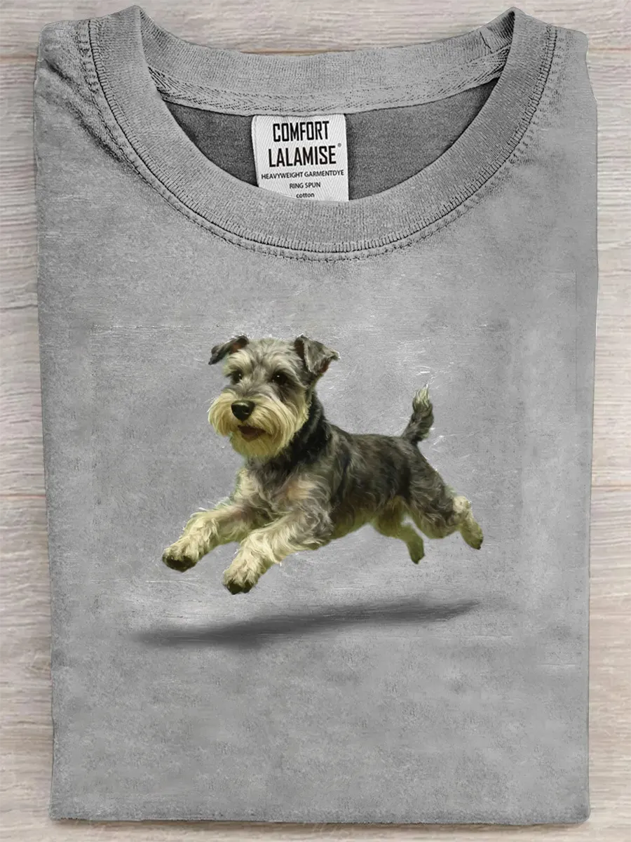 Retro Cute Run Schnauzer Art Print Casual Pure Cotton Short Sleeved T-shirt