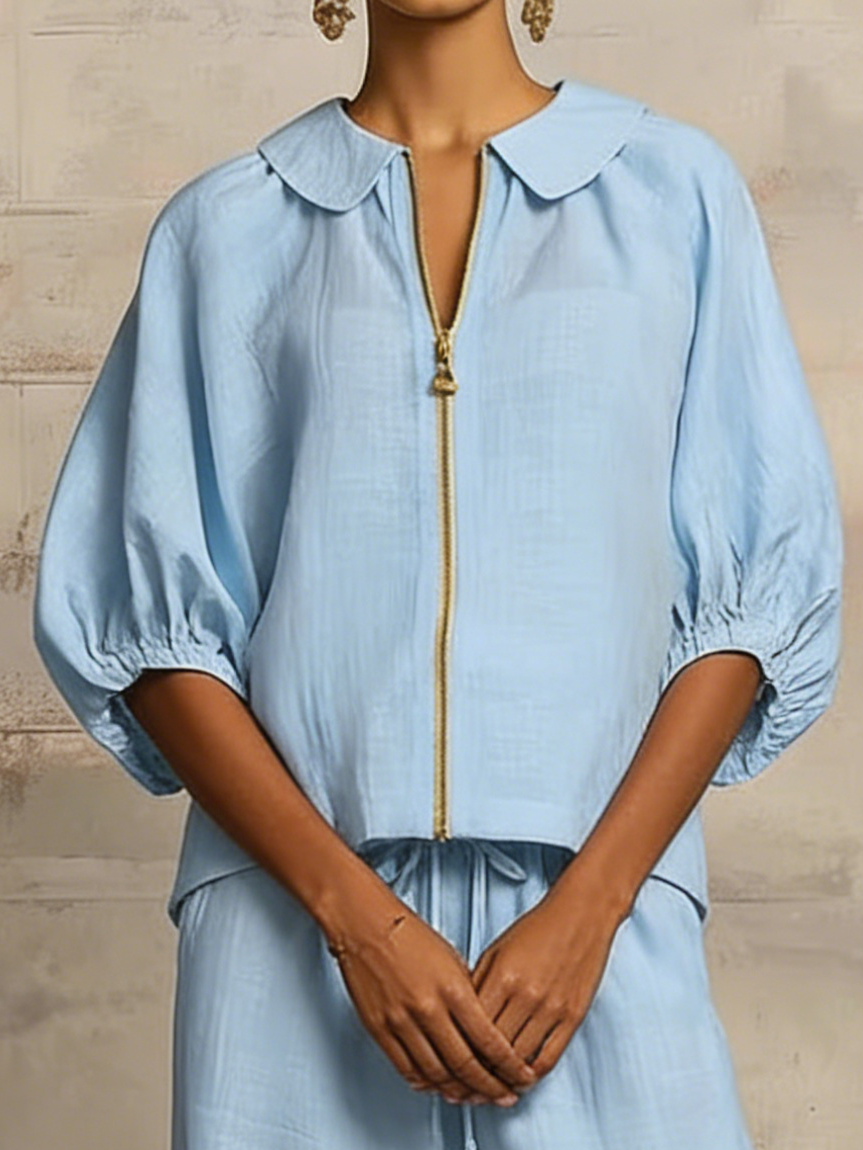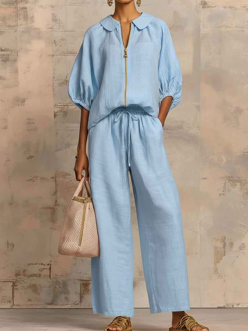 Stylish Peter Pan Collar Zip-up Shirt And Wide-leg Pant Linen Cotton Set