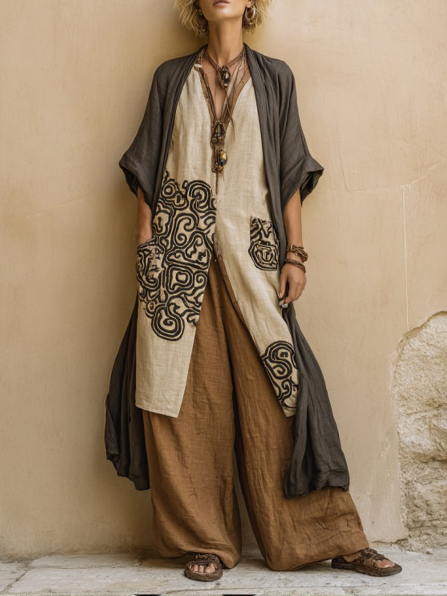 Casual Bohemian Linen And Cotton Long Cardigan And Sleeveless Top And Pants Three-piece Set