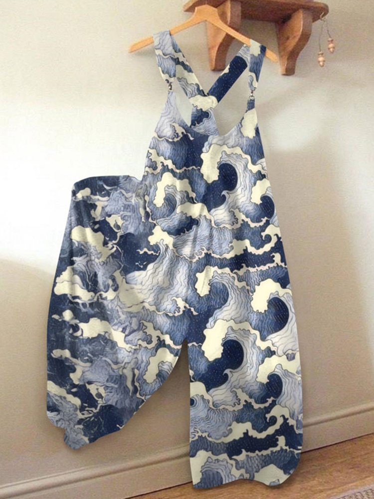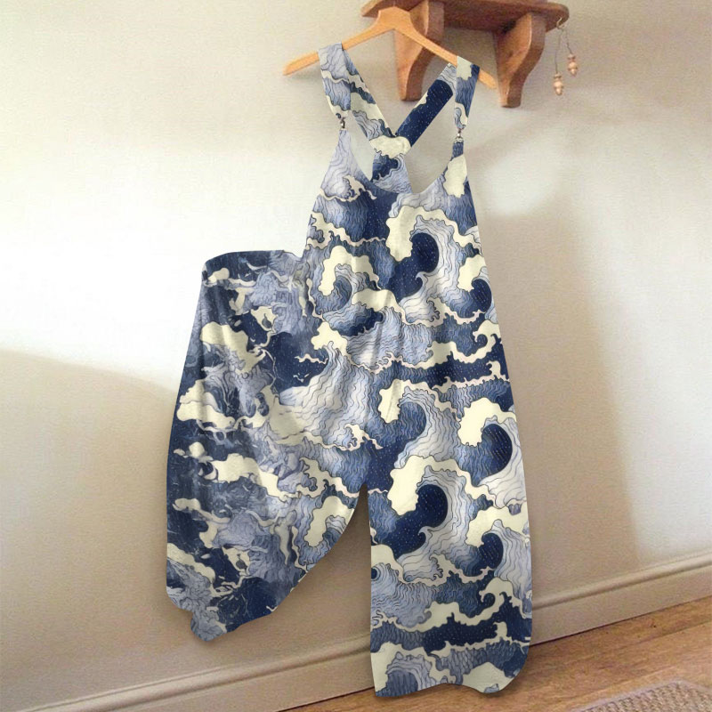 Japanese Art Wave Print Loose Casual Jumpsuit