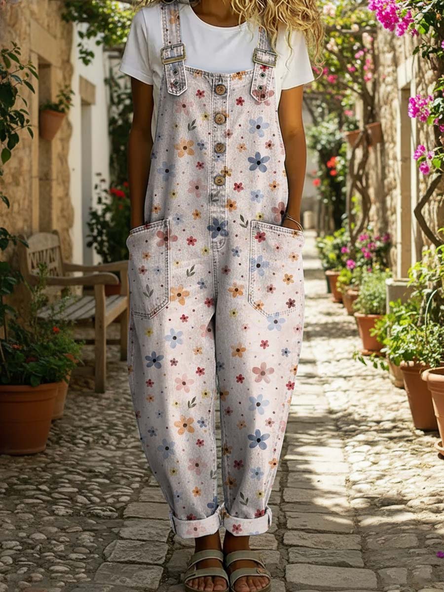 Women's Vintage Flower Print Casual Denim Jumpsuit