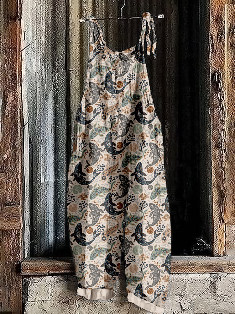 Floral Fish Pattern Linen Blend Loose Fit Jumpsuit