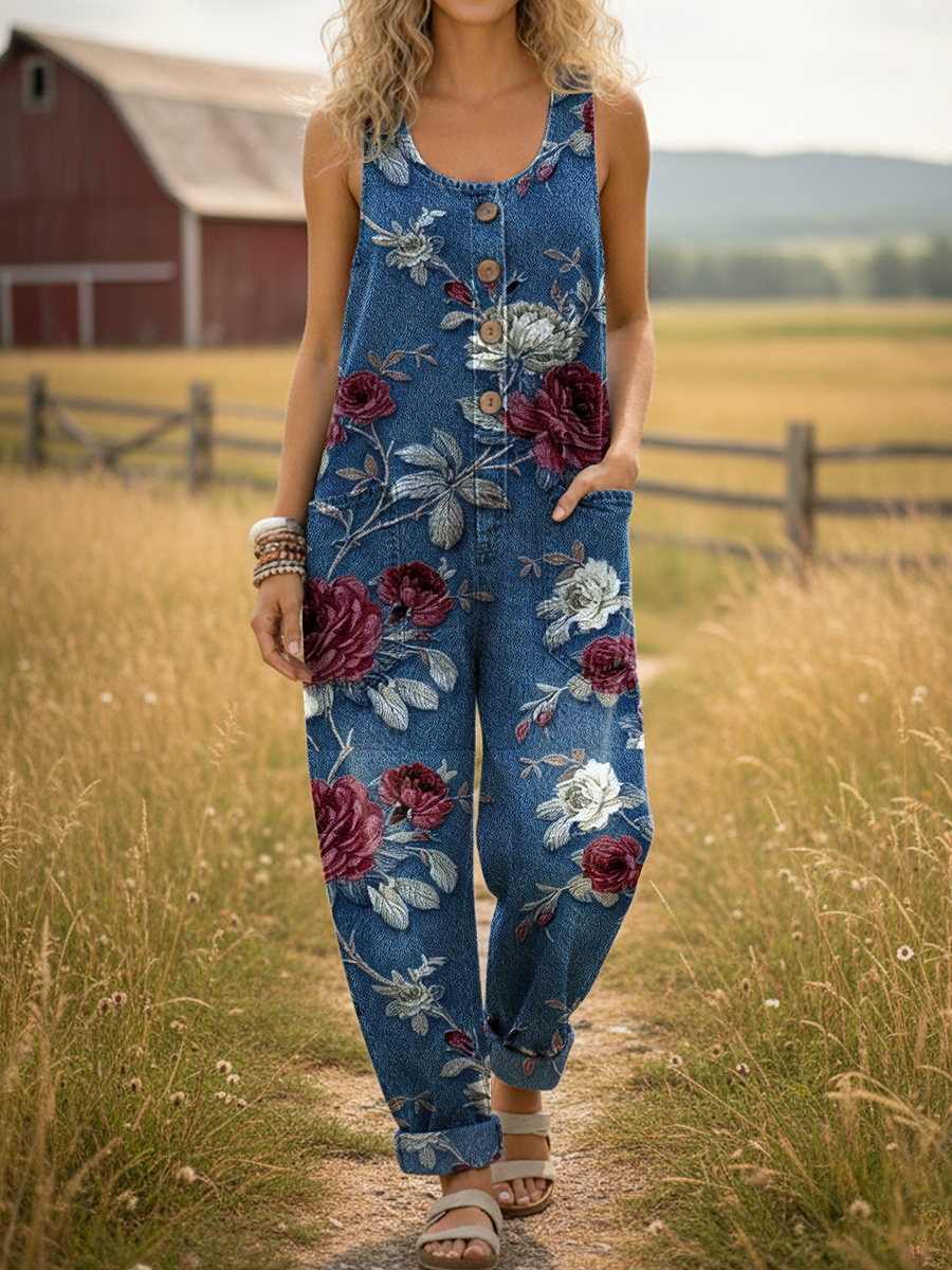 Women's Vintage Floral Print Casual Denim Jumpsuit