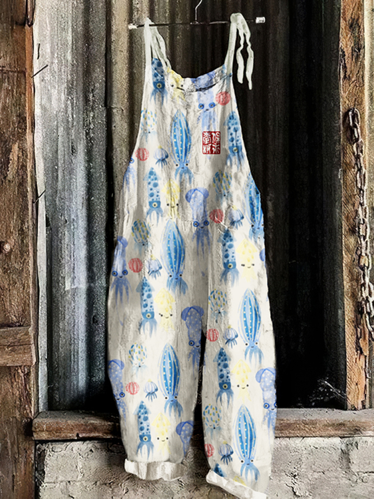 Vintage Japanese Art Cute Octopus Print Loose Jumpsuit