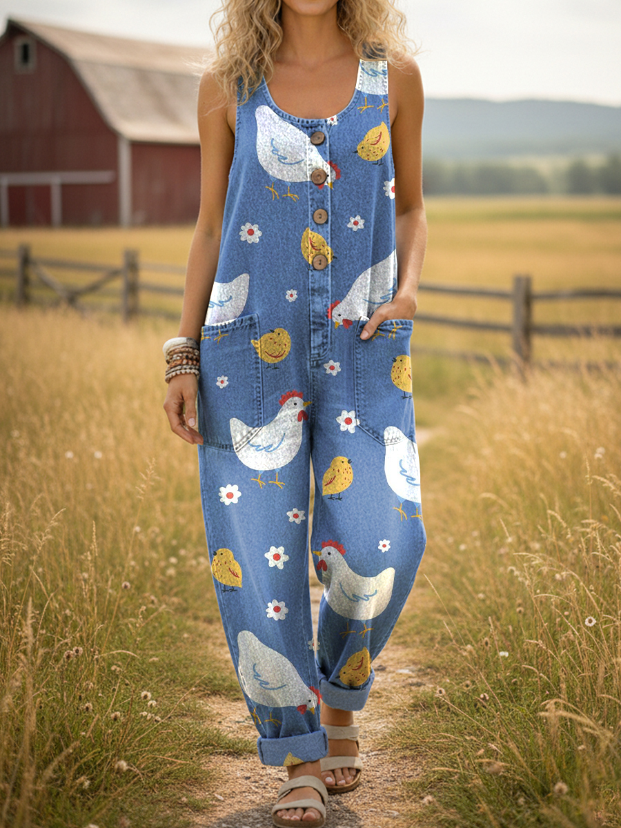 Women's Cute Chicken Print Casual Denim Jumpsuit