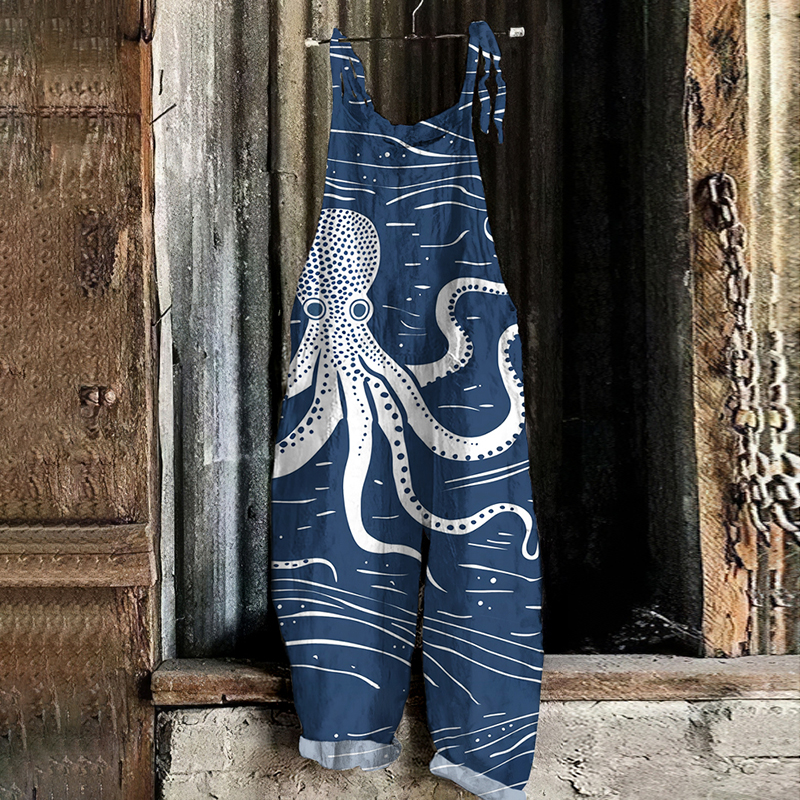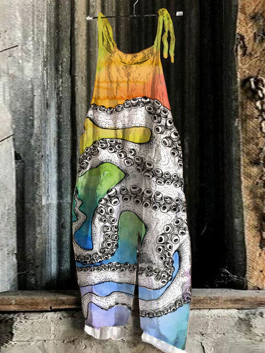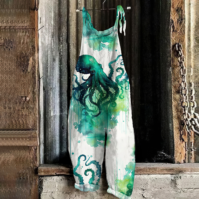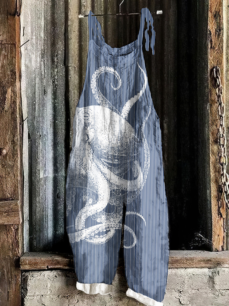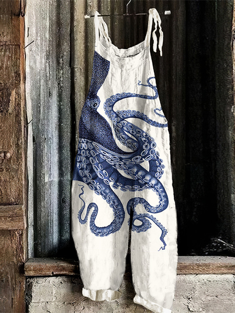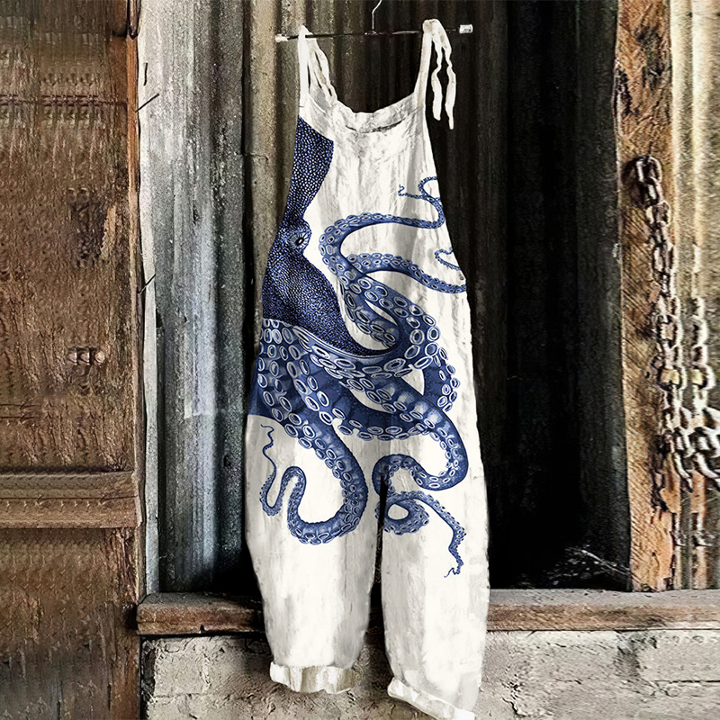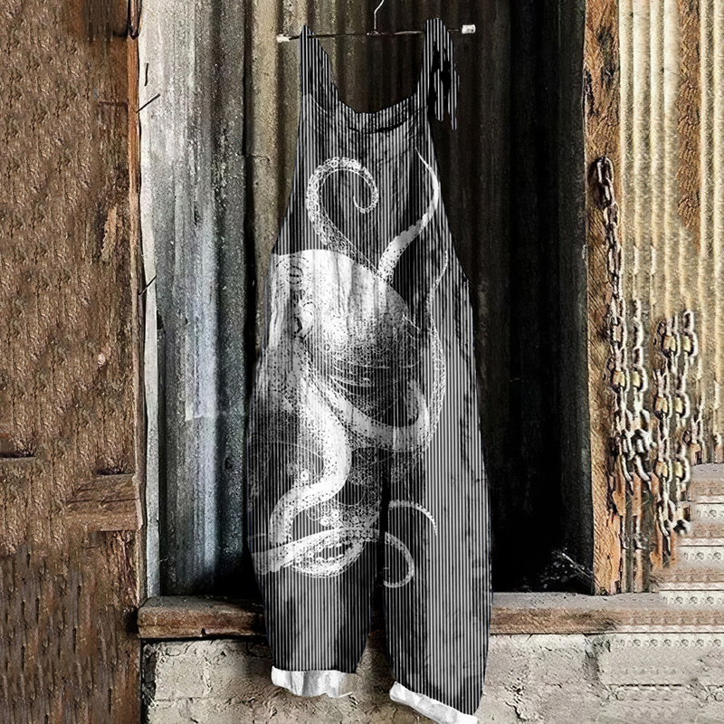 Japanese Art Vintage Octopus Print Casual Loose Jumpsuit