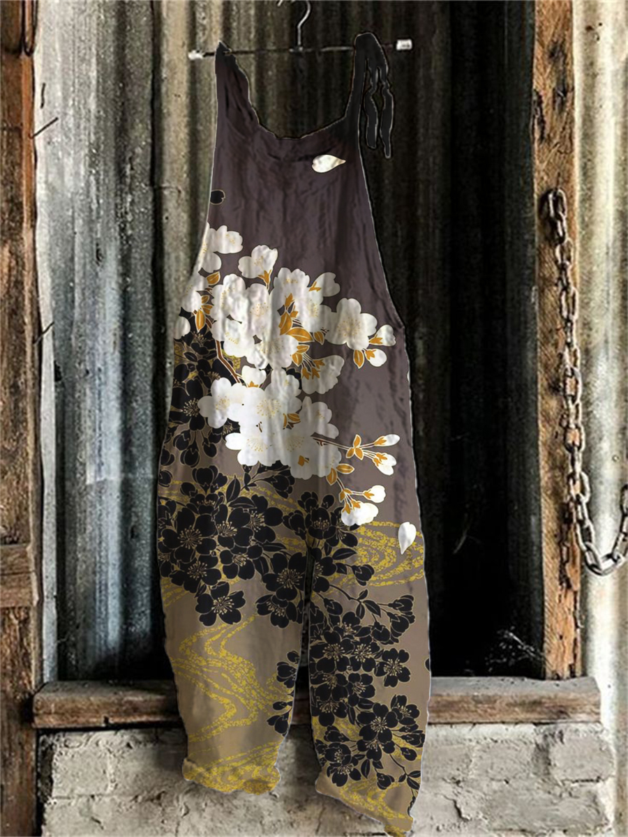 Japanese Art Floral Linen Blend Loose Casual Jumpsuit