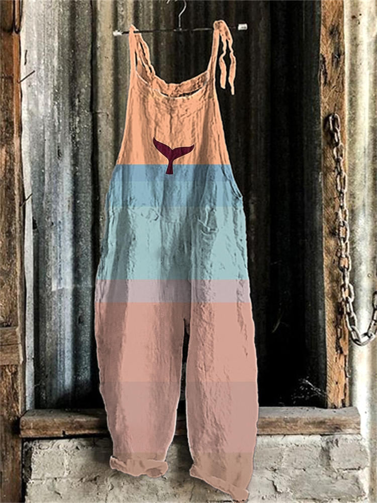 Whale Tail Print Linen Blend Casual Jumpsuit