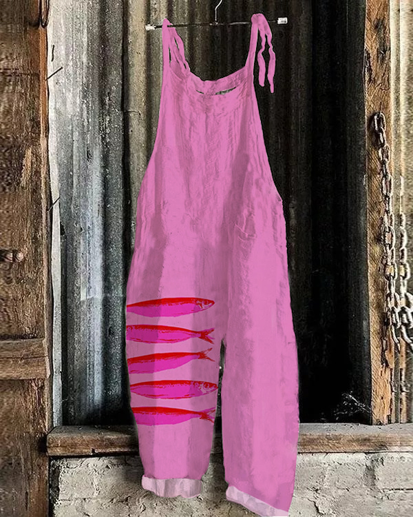 Vintage Pink Fish Art Print Loose Jumpsuit