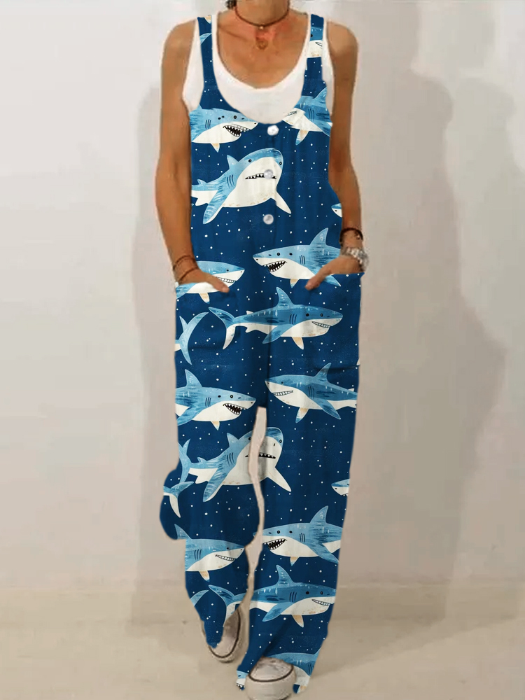 Deep Sea Animal Shark Pattern Linen Casual Jumpsuit
