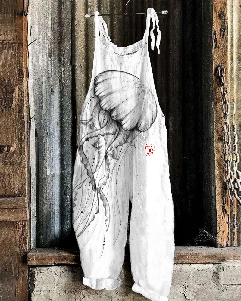 Vintage Japanese Art Ocean Jellyfish Printed Casual Jumpsuit