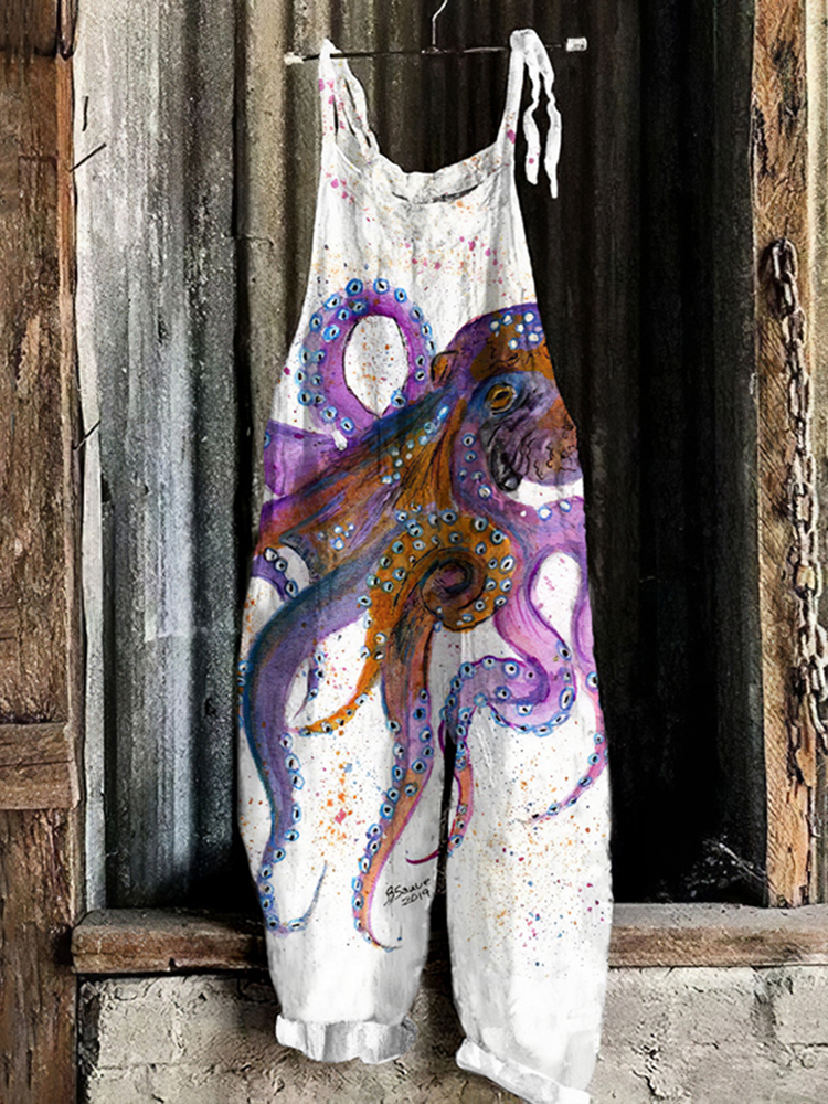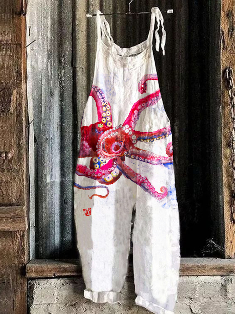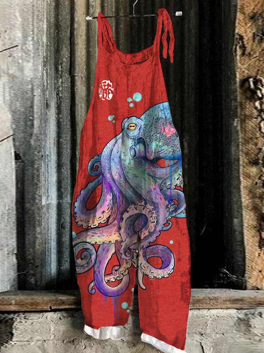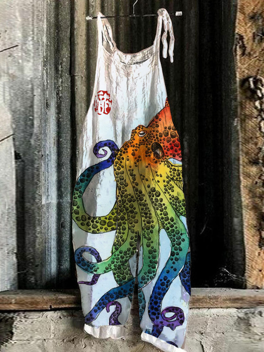 Vintage Colorful Octopus Linen Blend Loose Casual Jumpsuit