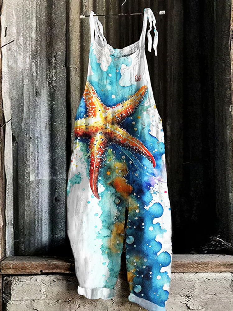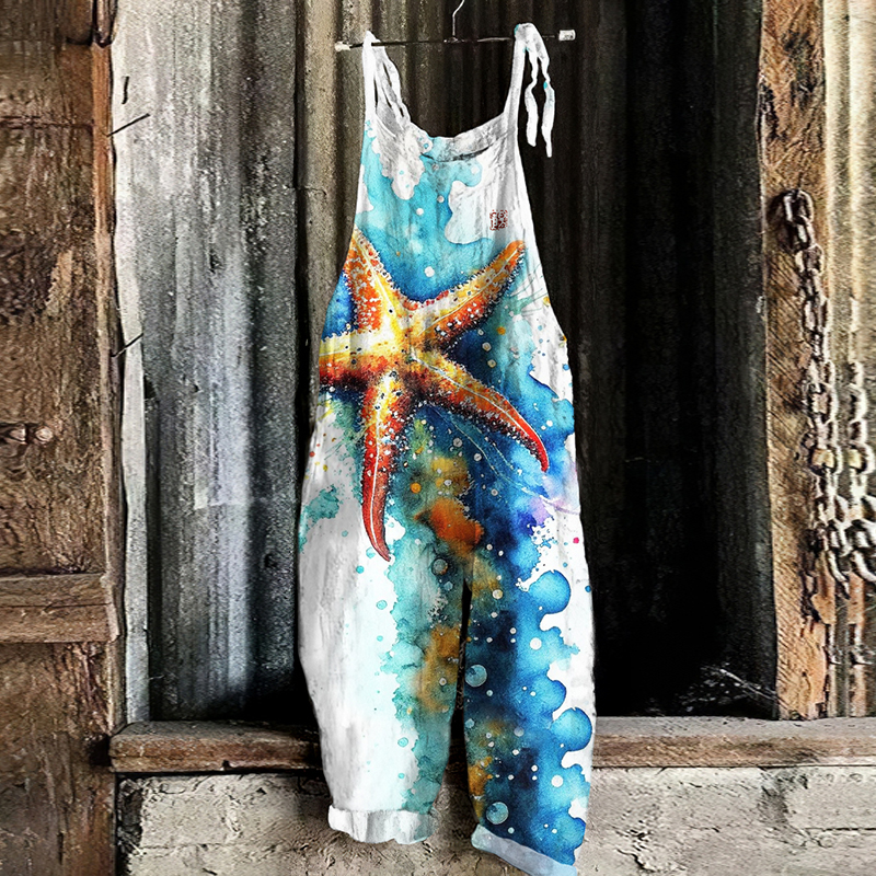 Vintage Japanese Art Watercolor Starfish Graphic Casual Loose Jumpsuit