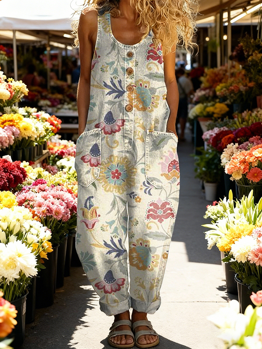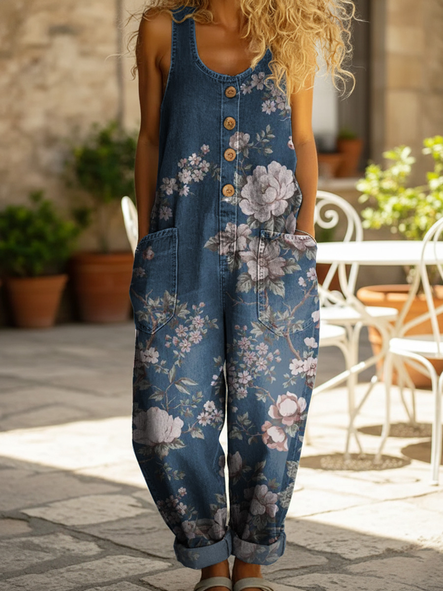 Women's Vintage Floral Art Print Casual Denim Jumpsuit