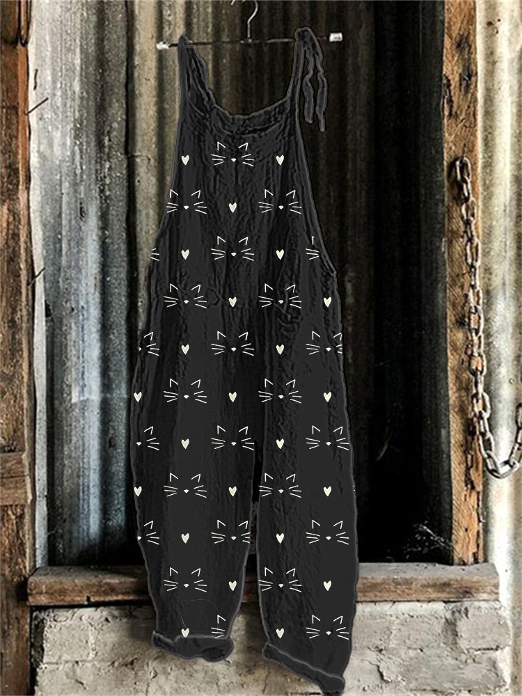 Cute Cat Face Printed Linen Blend Casual Jumpsuit