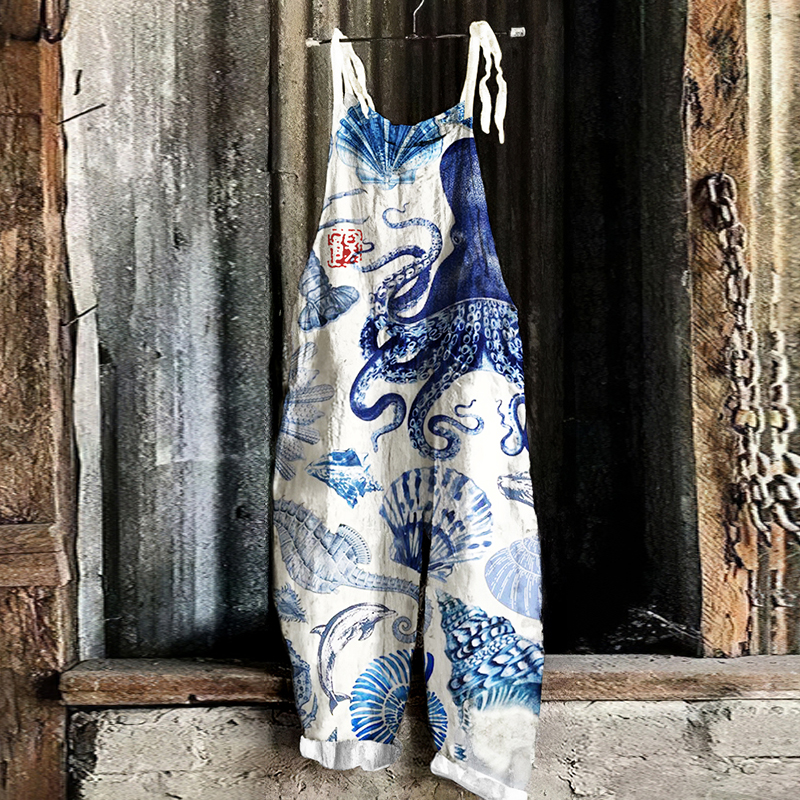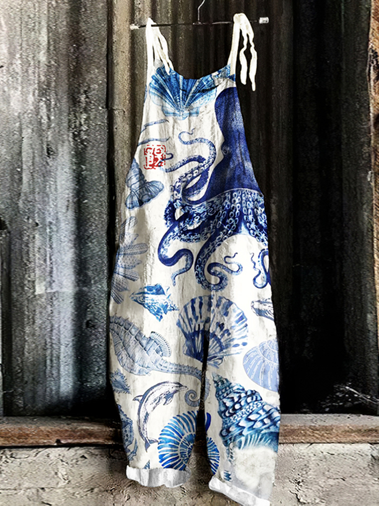 Vintage Octopus Marine Organisms Print Loose Casual Jumpsuit